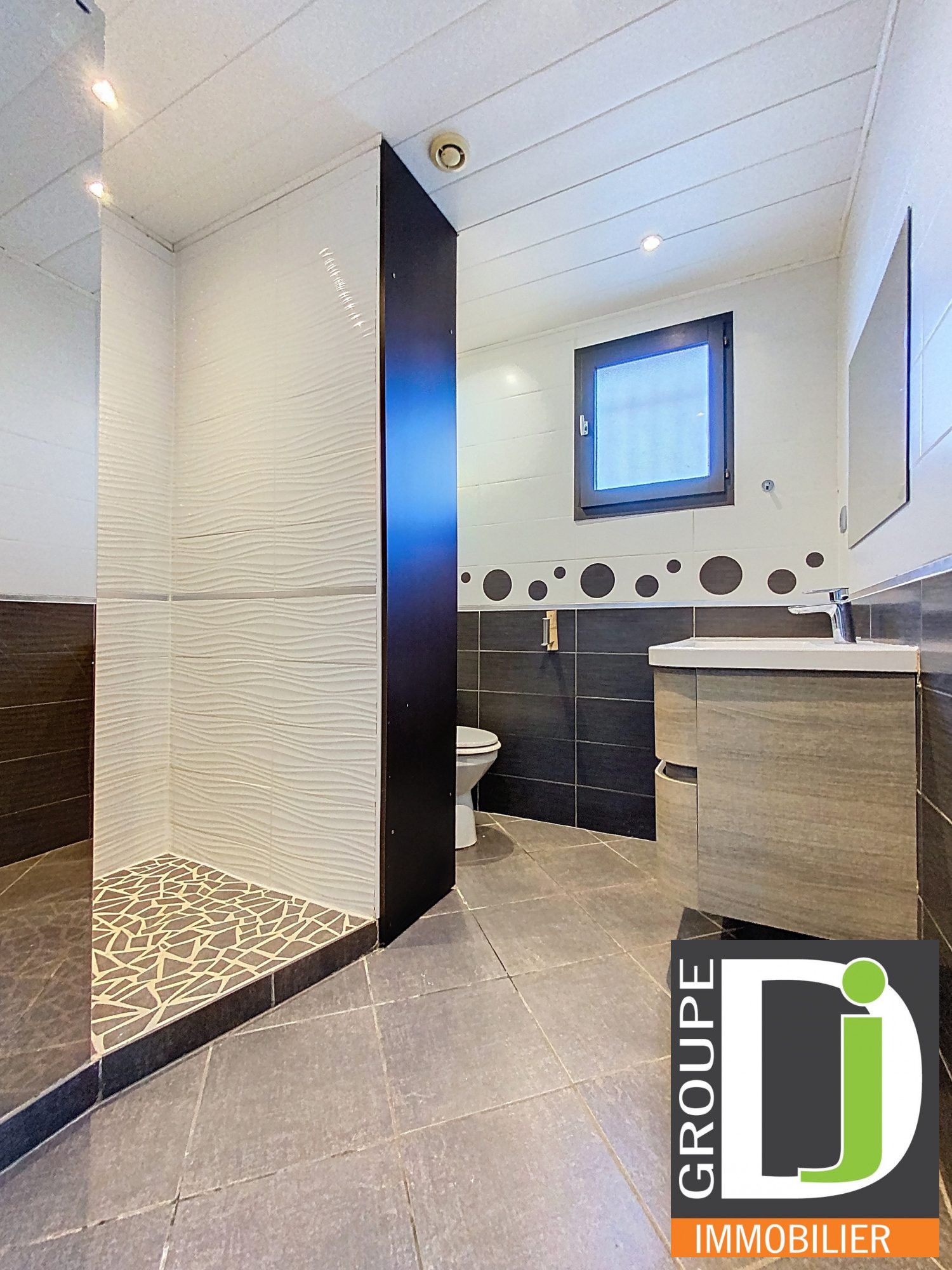 Elle se compose en rez-de-chaussée d'une entrée, cuisine équipée ouverte sur séjour en cathédrale pour une surface totale de 52.30m², salle d'eau avec WC et cellier/buanderie.