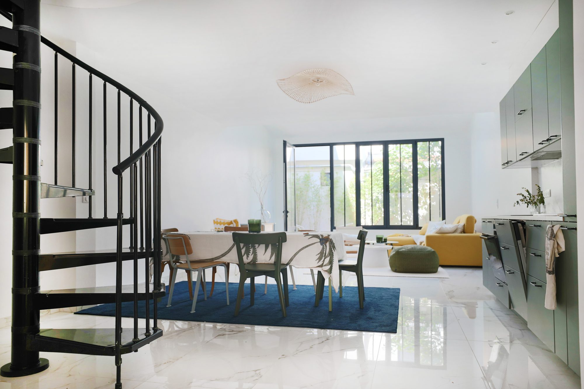 La cuisine américaine équipée est le lieu idéal pour préparer vos repas tout en profitant de la compagnie de vos proches. Elle vous donne accès à une seconde terrasse où vous pourrez partager vos repas, et y garer vos vélos grâce à un accès sur rue.