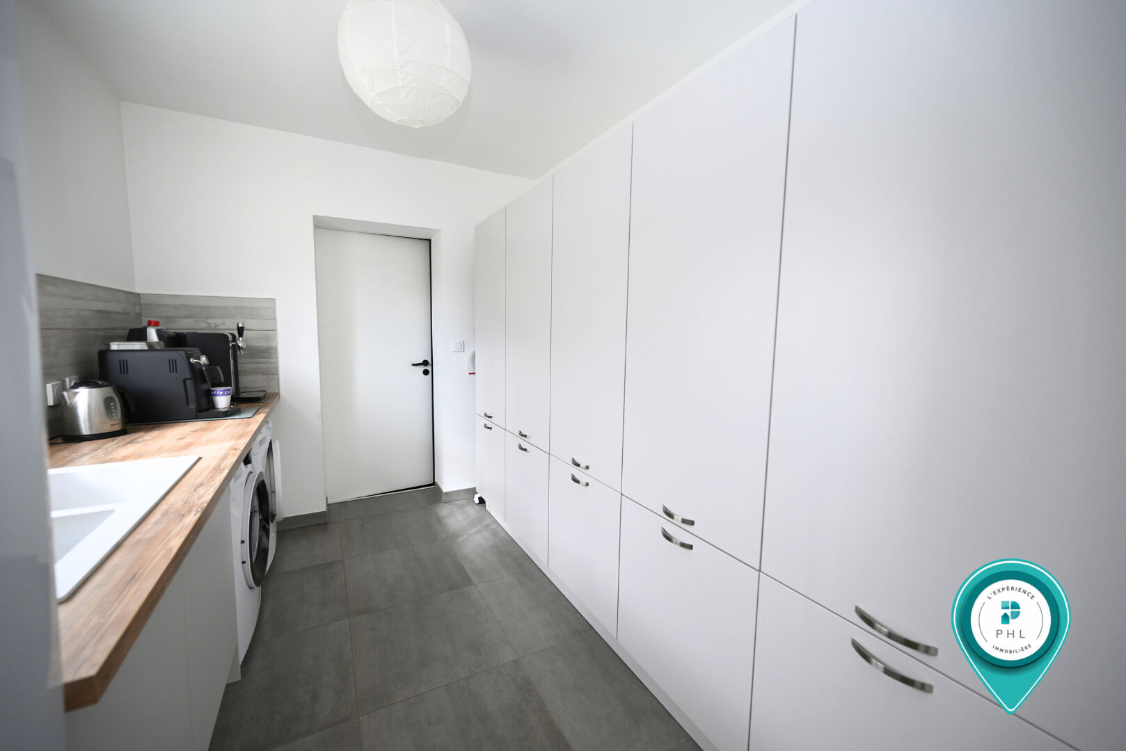 Comprenant au RDC : pièce de vie avec salon - séjour - cuisine ouverte aménagée et équipée, arrière-cuisine entièrement aménagée avec rangements sur-mesure - arrivées/évacuations d'eau pour machines - évier, donnant accès au garage, grande chambre avec placard aménagé et possibilité de créer une salle d'eau, et WC indépendant avec lave-mains.