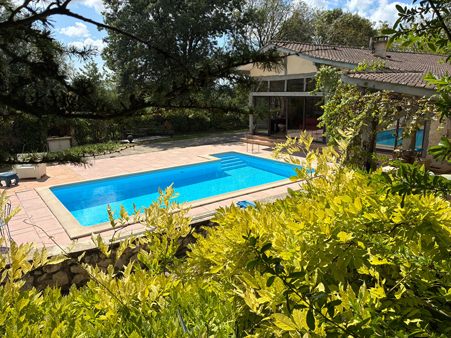 À l'extérieur : parc clos d'environ 30 560 m², piscine au chlore (4x8 m, fond plat 1,5 m), garage attenant et carport pour deux véhicules.
