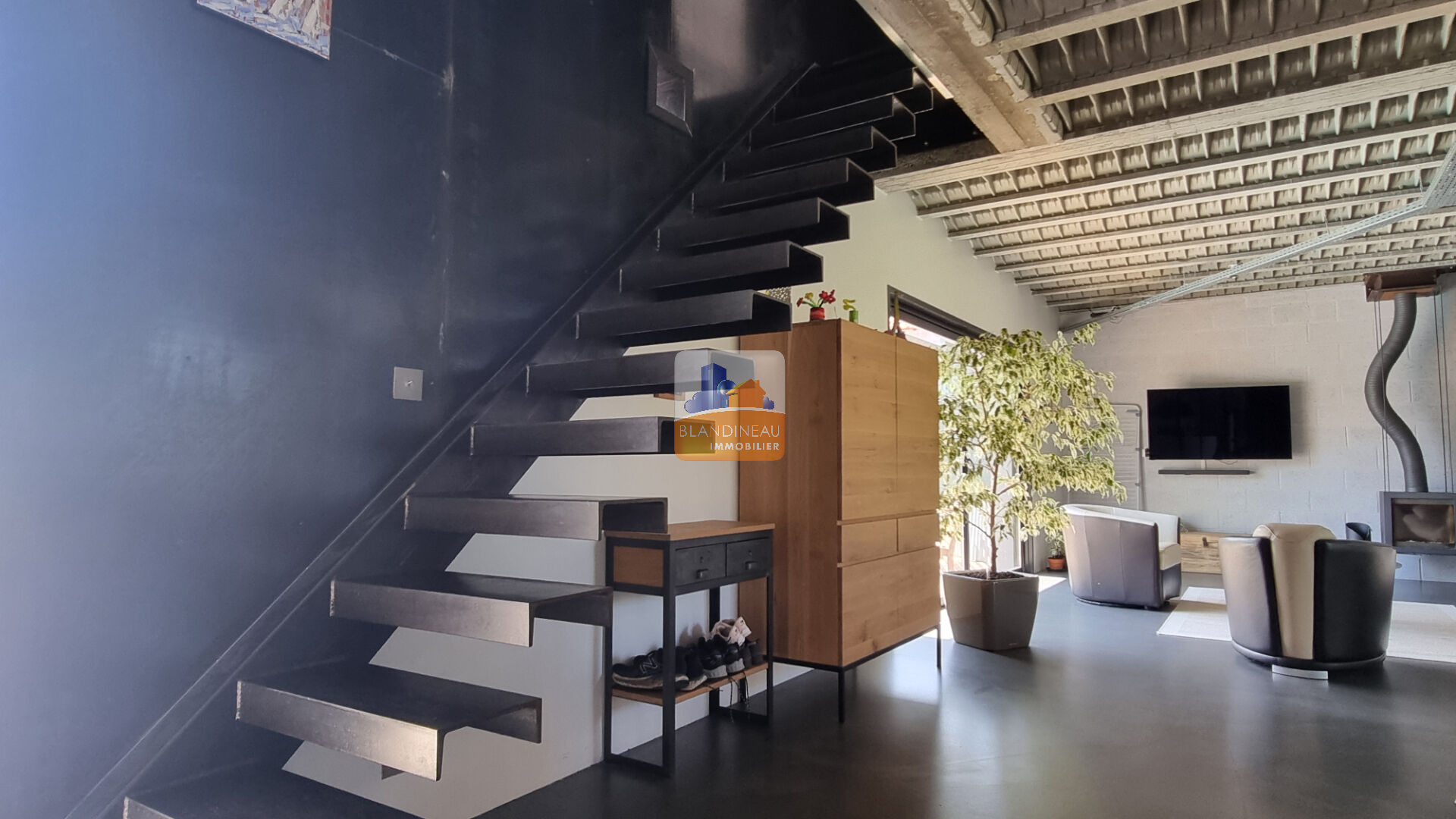 Nichée au calme, maison contemporaine de 2010 d'environ 150 m² habitables, excellentes prestations, offrant en Rdc une pièce à vivre de 62 m² sur béton cirée avec poêle à bois, cuisine aménagée et équipée avec îlot central, une buanderie, un espace bureau, 2 chambres (13 m² et 9 m²), une salle de bains (baignoire et douche), wc.
