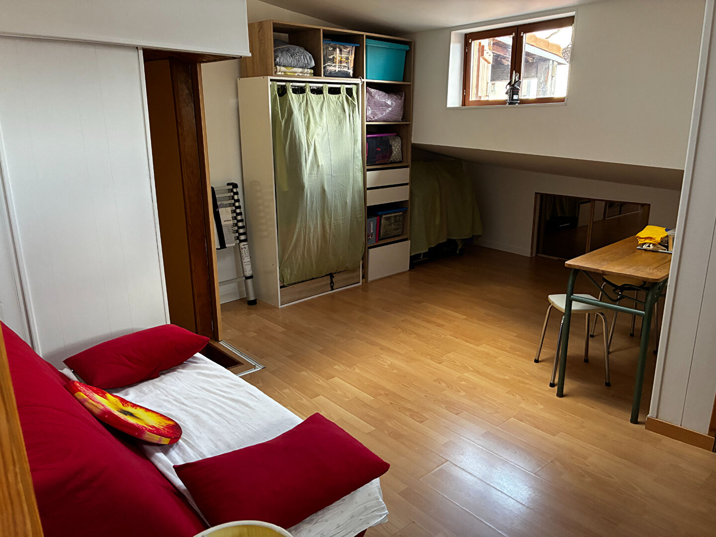 Le deuxième étage propose une seconde chambre avec rangements.