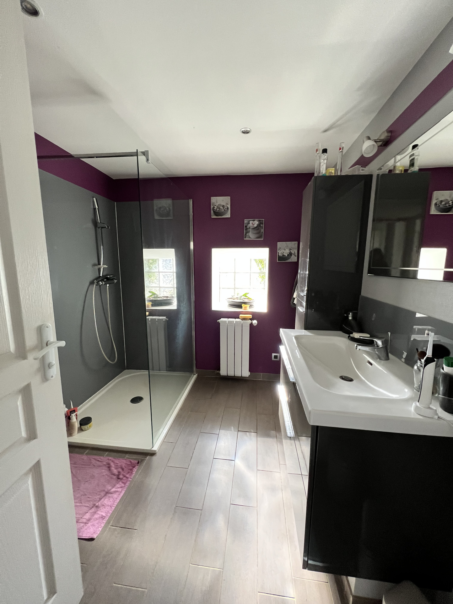 A l'étage : une chambre avec un wc sanibroyeur, une autre chambre, une salle de bains.