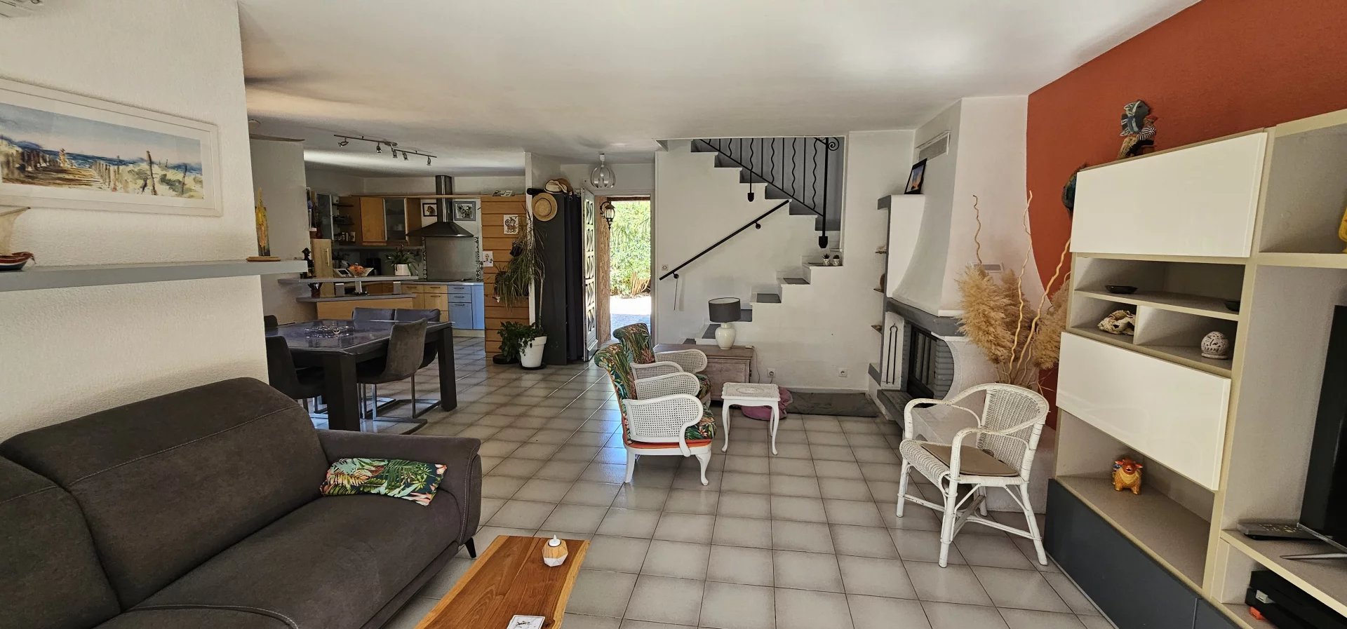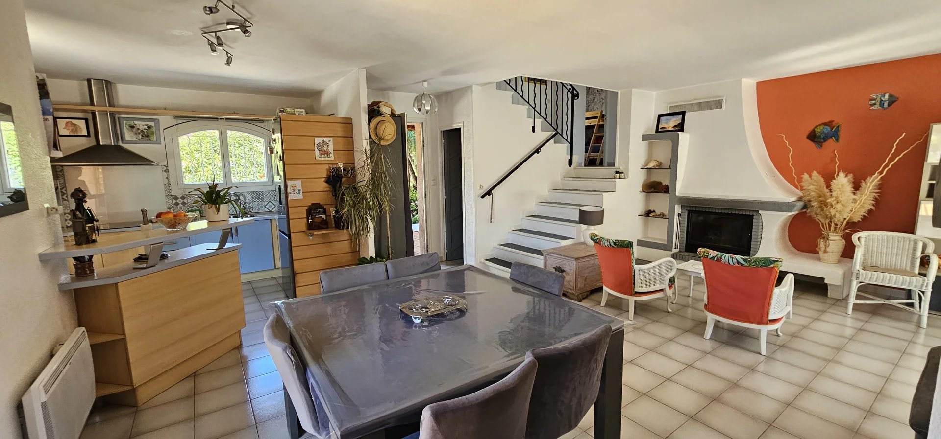 - Au rez de chaussée : une grande pièce à vivre lumineuse, avec coin cuisine, coin repas, salon, cheminée et accès à la terrasse ainsi qu'au jardin.