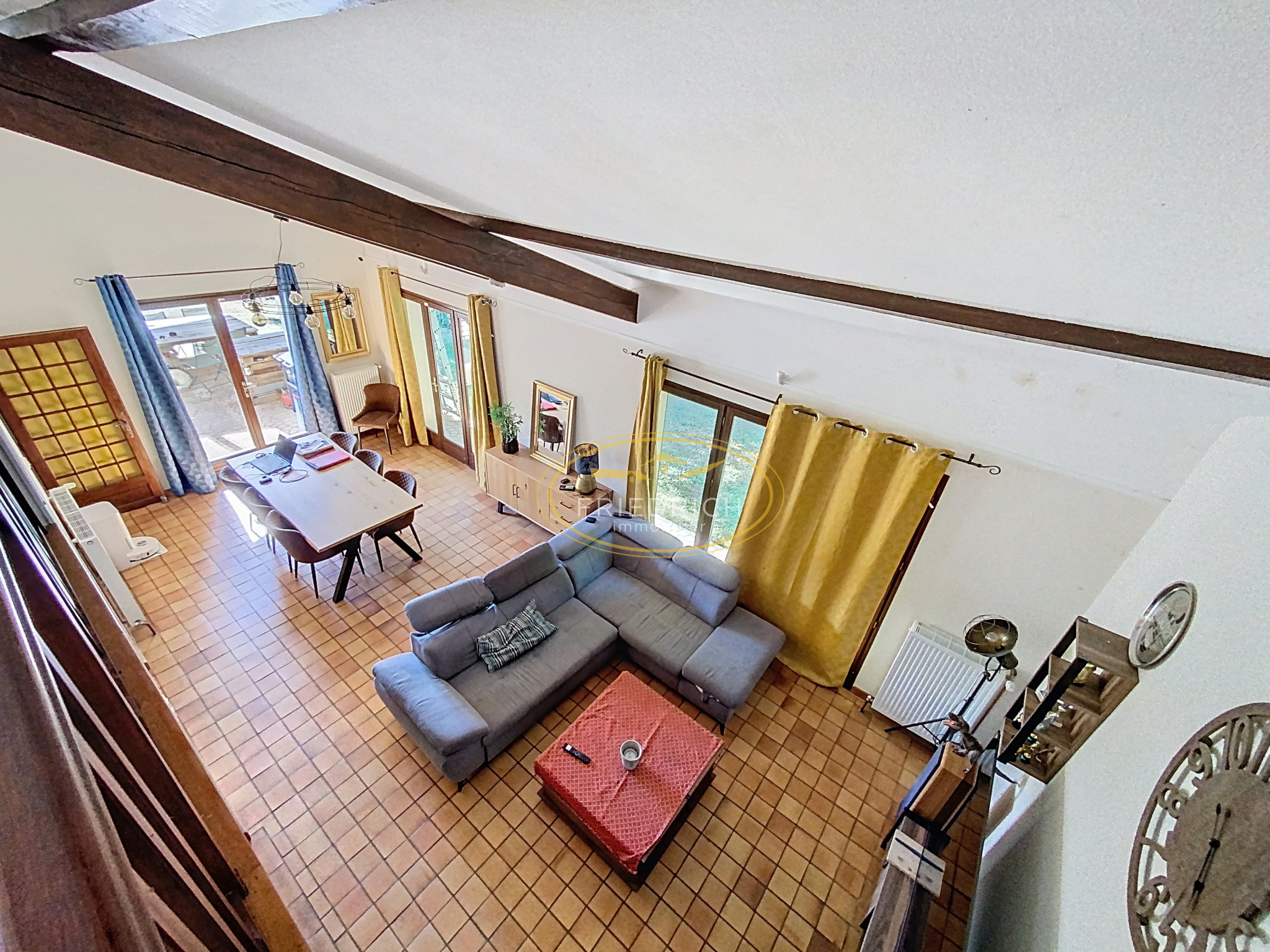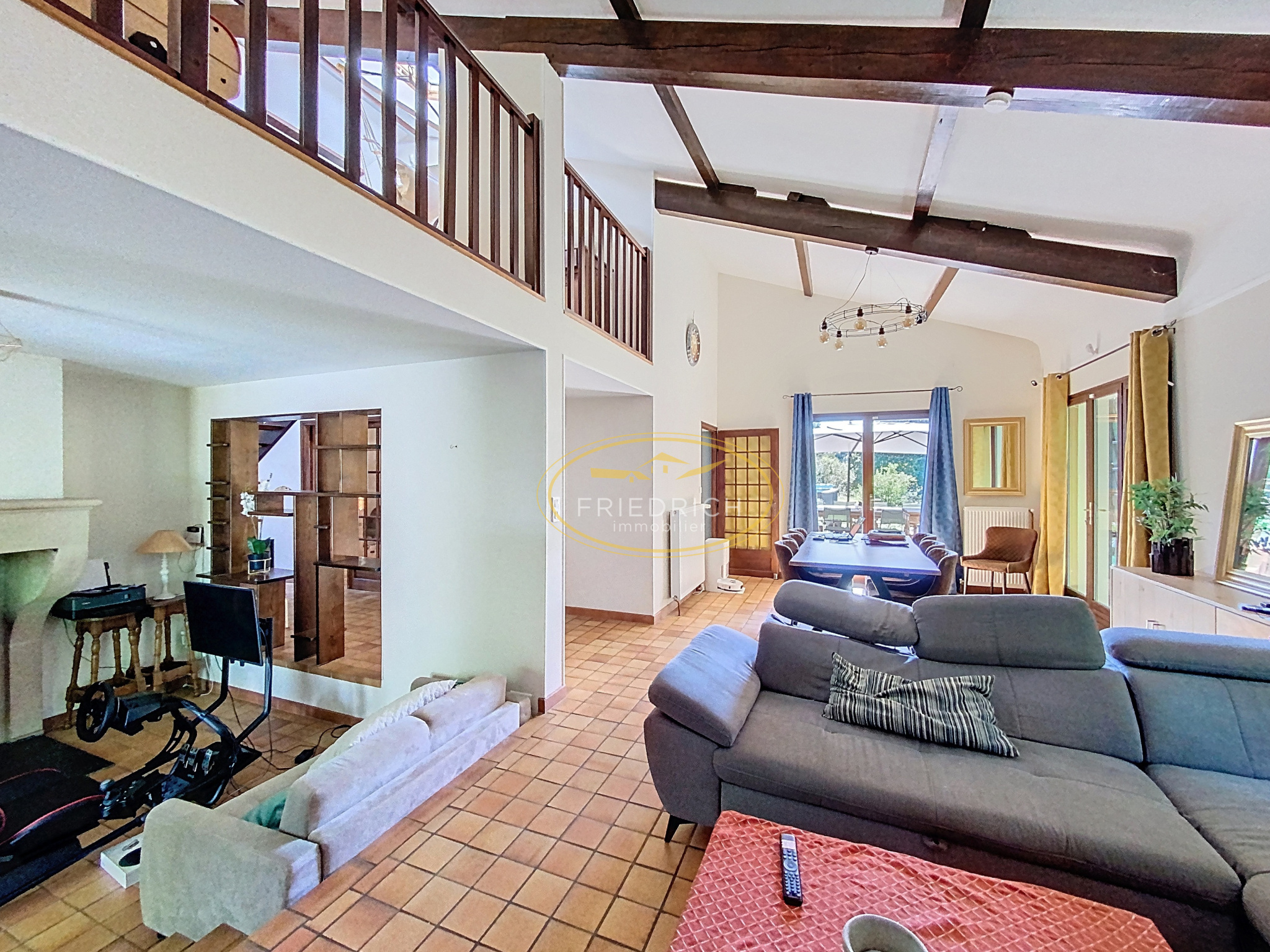 - Salle à manger / salon (25,60m2 + 16.90), sol carrelage, cheminée lorraine avec poêle à bois (TurboFrance) avec système de répartition de chaleur. Nombreuses portes fenêtres ouvrant sur la terrasse et le jardin.