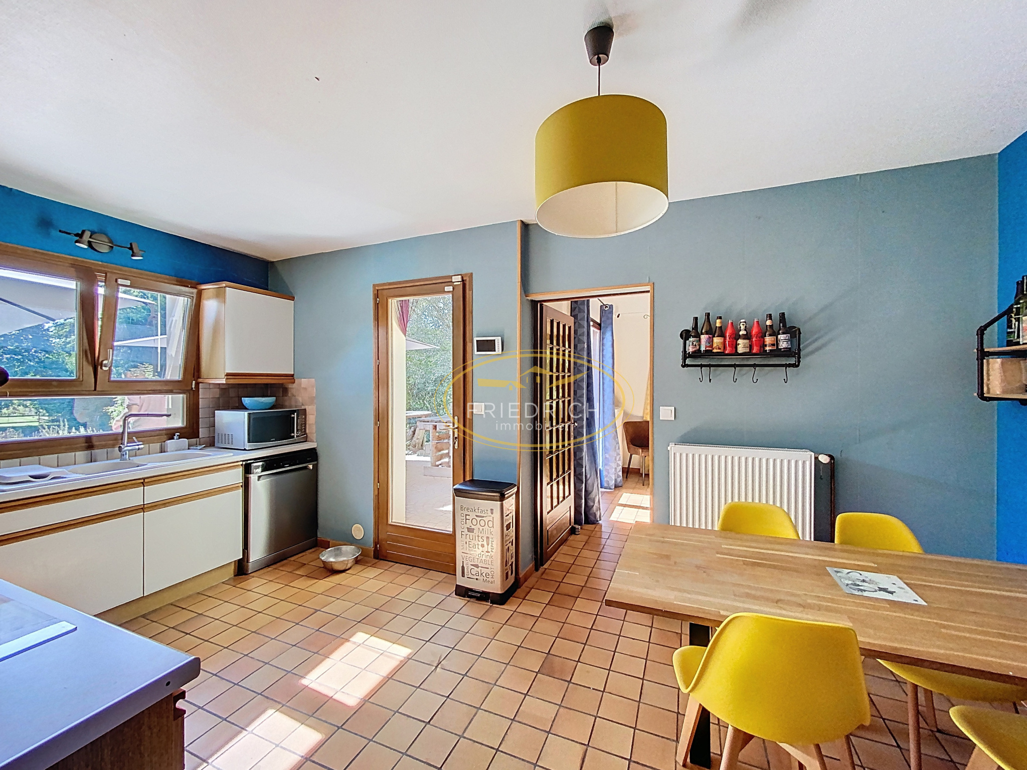 - Cuisine équipée (14,30m2), sol carrelage. Eléments haut et bas, plaque 3 feux gaz + 1 plaque électrique, hotte, four électrique, lave-vaisselle. Porte vitrée ouvrant sur grande terrasse ensoleillée.