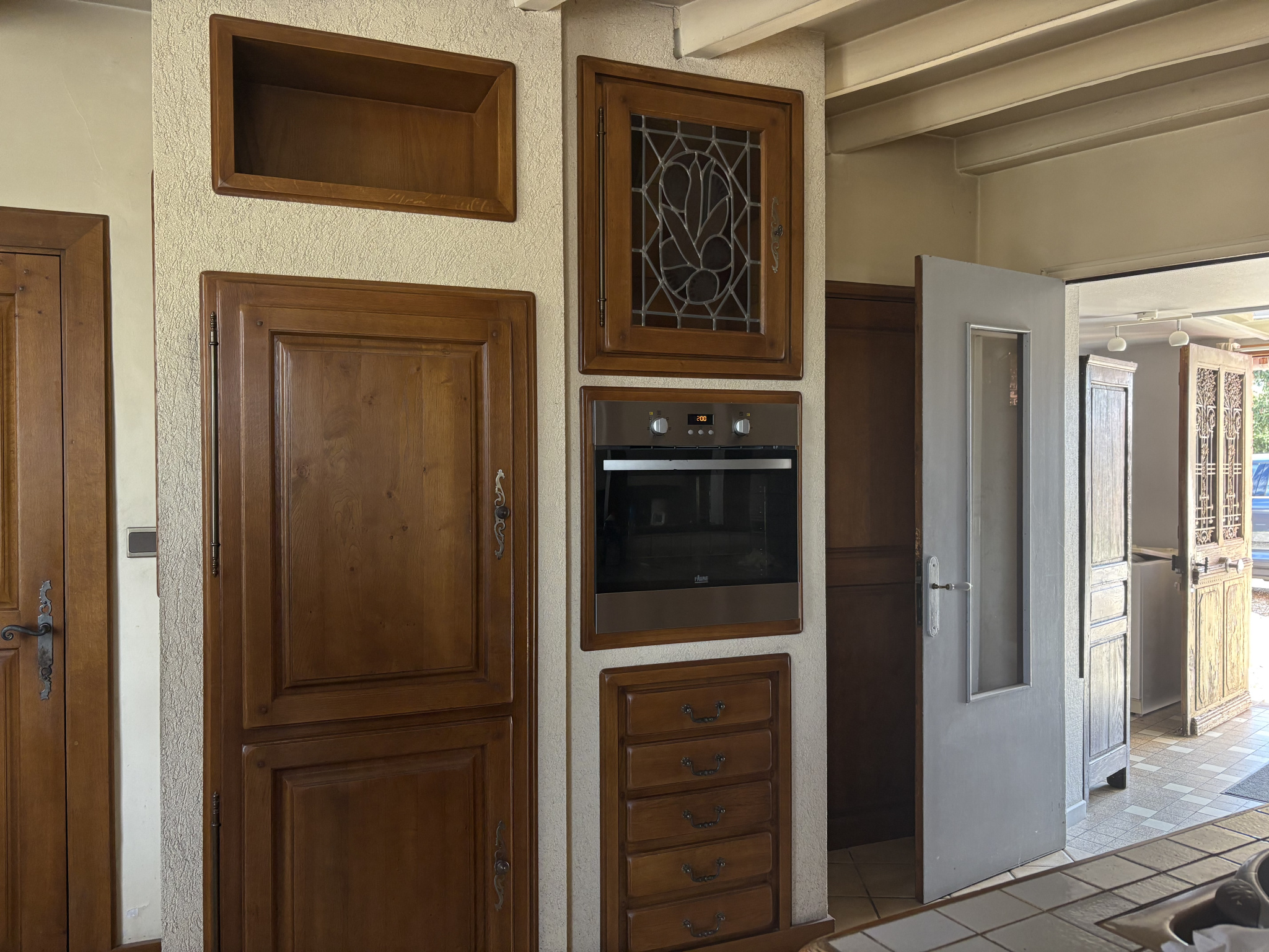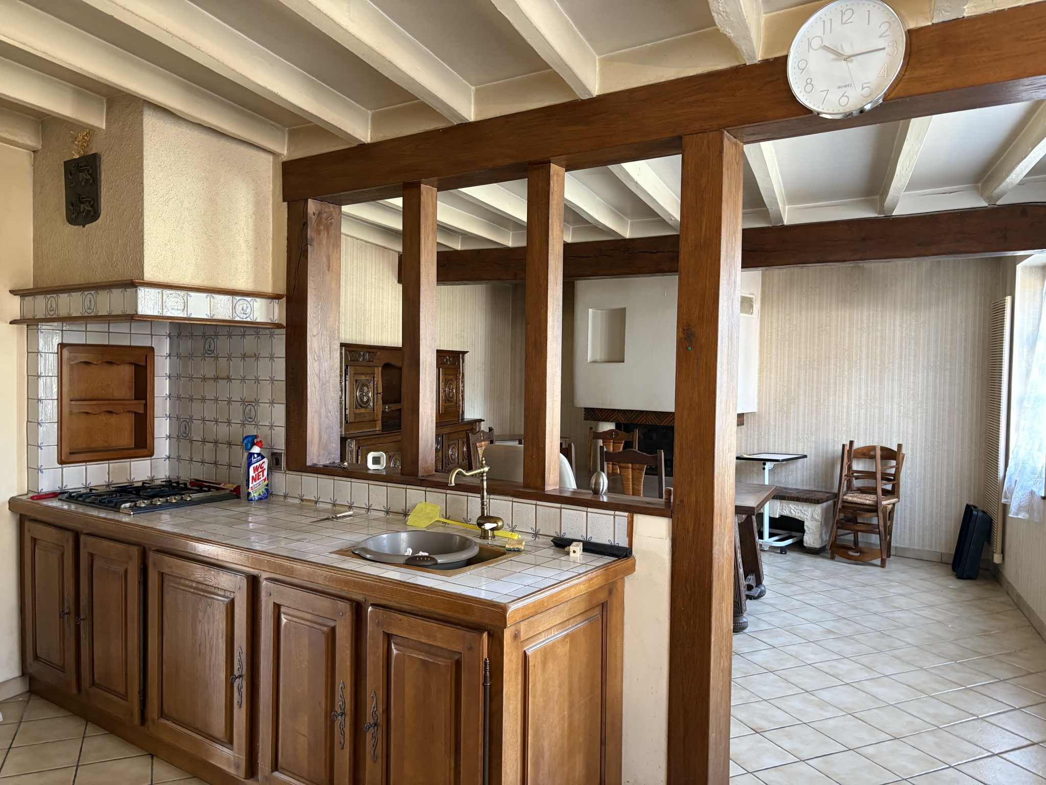 Rdc: Entrée, cuisine aménagée et équipée ouverte sur le séjour avec cheminée/insert, ancienne épierie à transformer en salon ou nouvelle activité, salle d'eau, wc.
