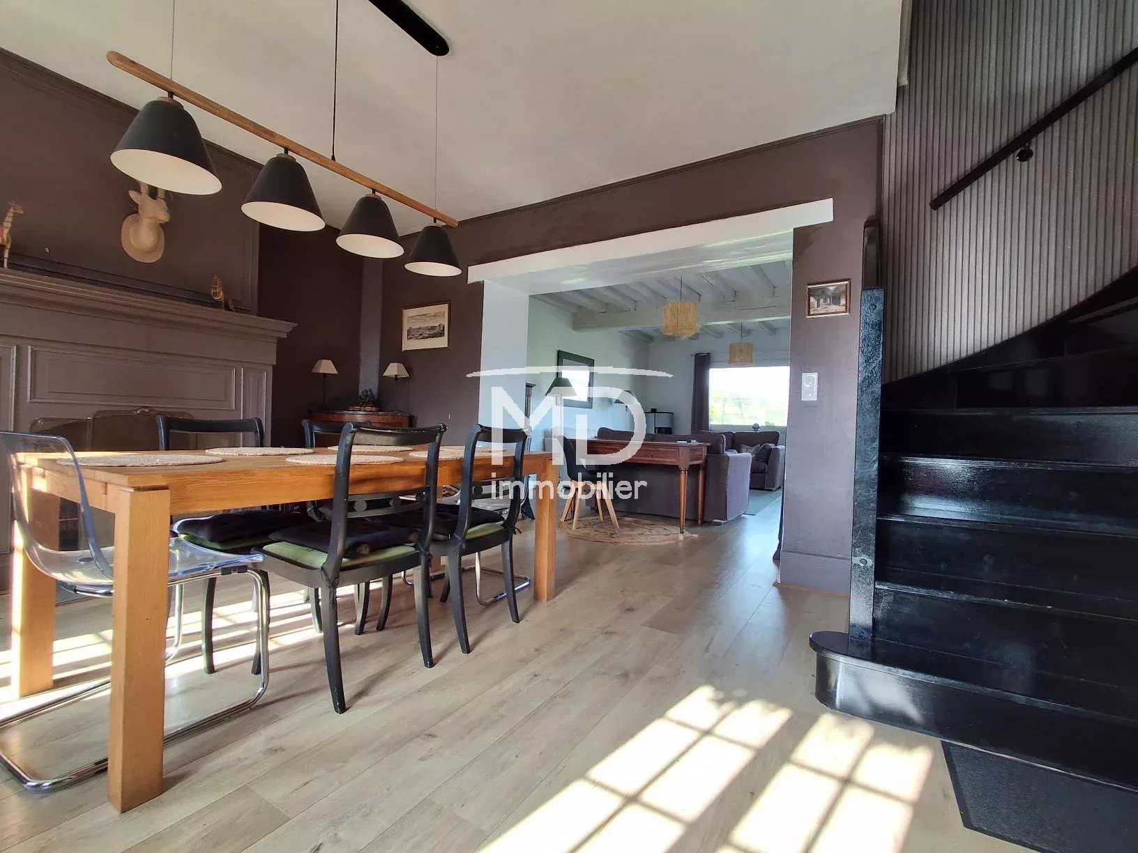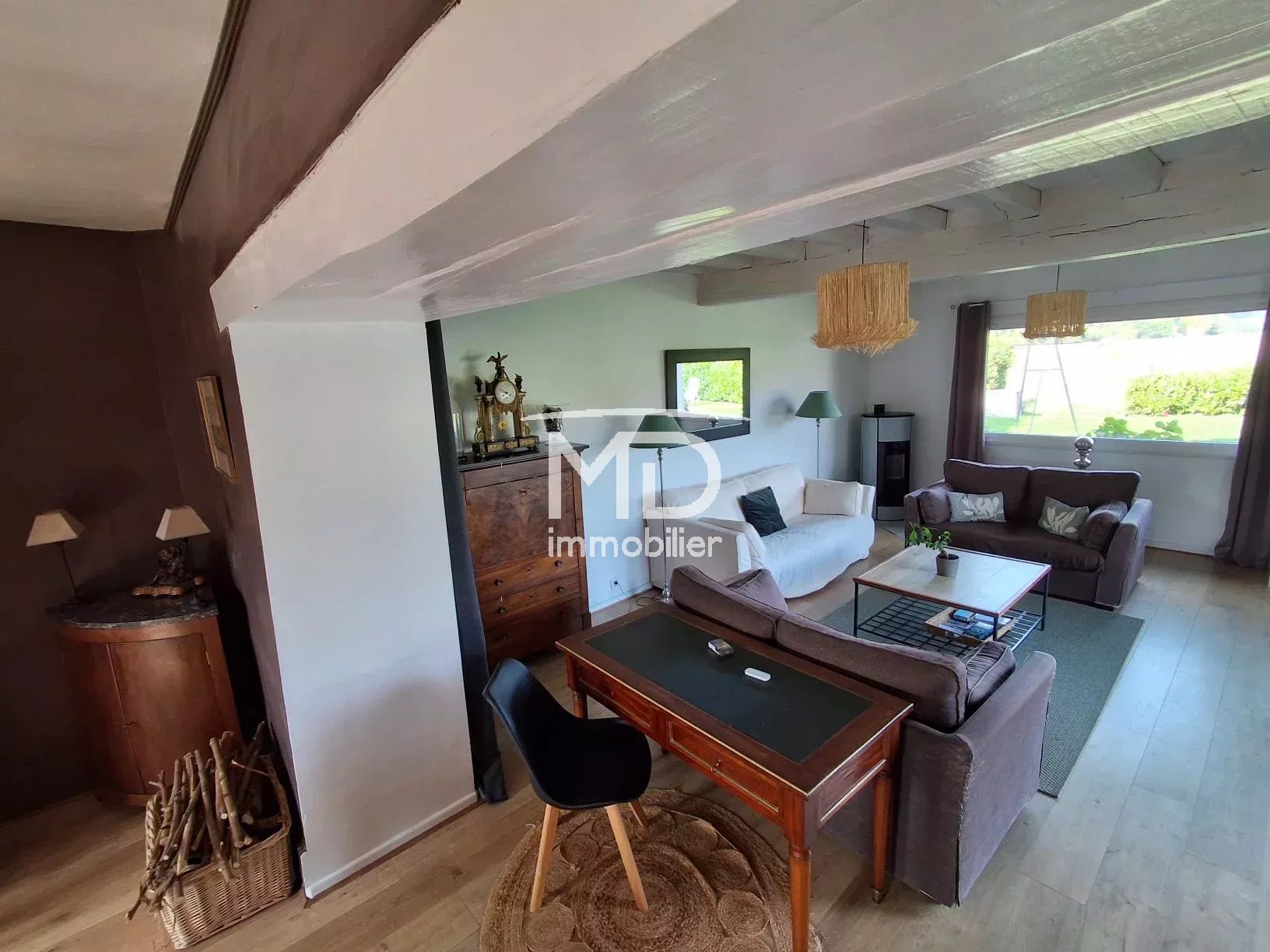 - Au rez-de-chaussée : entrée avec vestiaire, double séjour de 50m² avec cheminée et poêle à granulés, donnant sur une terrasse ensoleillée avec vue dégagée, cuisine aménagée et équipée, une chambre avec salle de douche et WC privatifs, buanderie, 2ème WC.