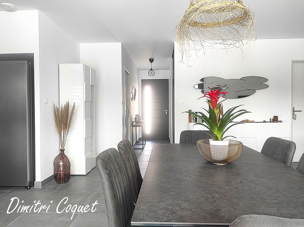 Une entrée avec placards,? une spacieuse et lumineuse pièce de vie de 52 m² avec une cuisine ouverte haut de gamme entièrement équipée, trois chambres confortables, toutes équipées de placards, deux wc indépendants et un garage de 17 m2 carrelé et isolé.