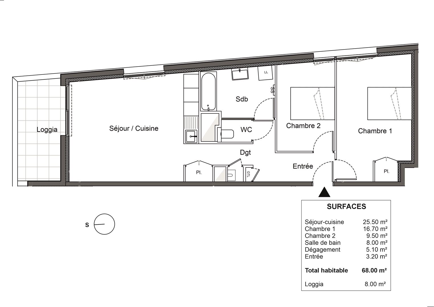 Bordeaux-Mérignac, beau T3 de 68 m², au troisième étage d?une résidence de 52 logements, répartis sur trois bâtiments. Il se compose d?une entrée, d?une pièce de vie ouvrant sur une belle loggia, de deux chambres, d?une salle de bains et d?un wc. Conforme à la norme BBC-RT2012, il est équipé d?un chauffage individuel au gaz. Il dispose d?une place de stationnement au sous-sol. Les commerces sont au pied de la résidence ainsi que le tram A qui permet d?accéder rapidement au centre-ville de Bordeaux, ou à l?aéroport. Écoles, collège et lycée sont accessible à pied. Il sera disponible en décembre 2026. Taxe foncière 900euros, charges mensuelles 90 euros. Les honoraires d?agence sont à la charge du vendeur. Les risques auxquels ce bien est exposé sont disponibles sur le site Géorisques: www.georisque.gouv.fr