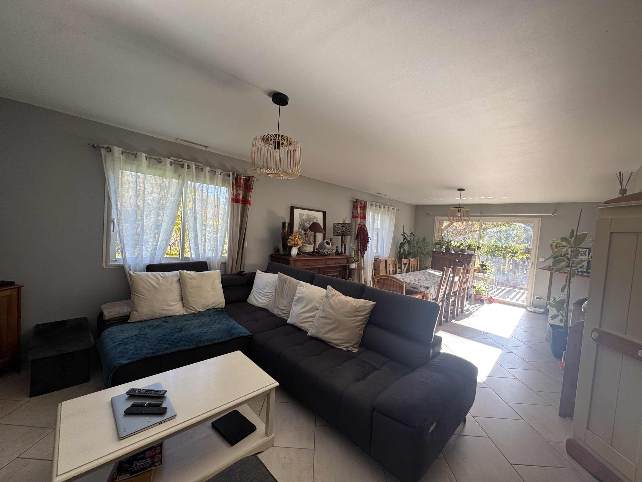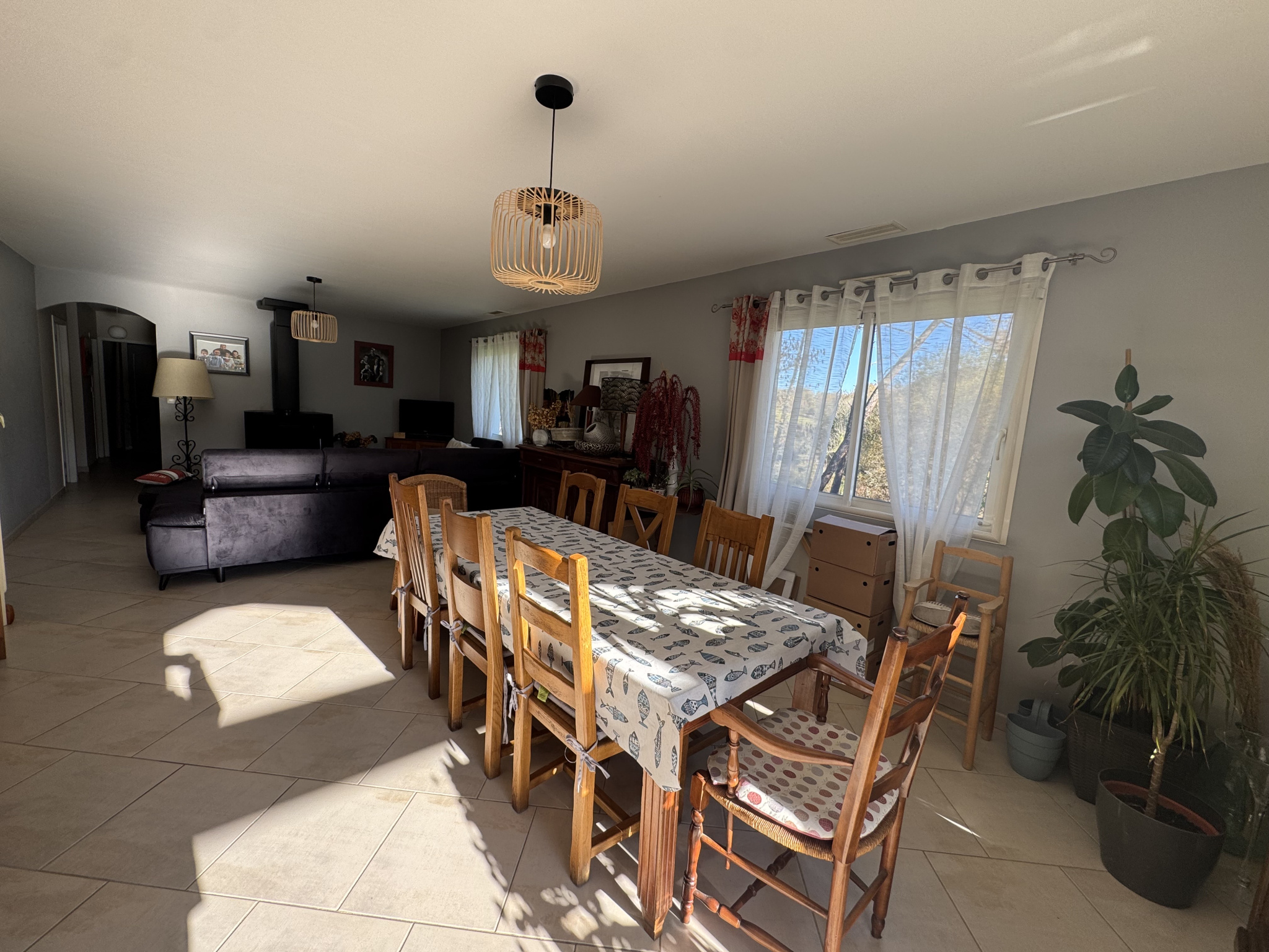L'entrée avec placards dessert un vaste salon séjour lumineux agrémenté d'une cheminée. La cuisine est aménagée et équipée, ouverte sur une belle terrasse. Un cellier complète l'espace de vie pour plus de fonctionnalité.