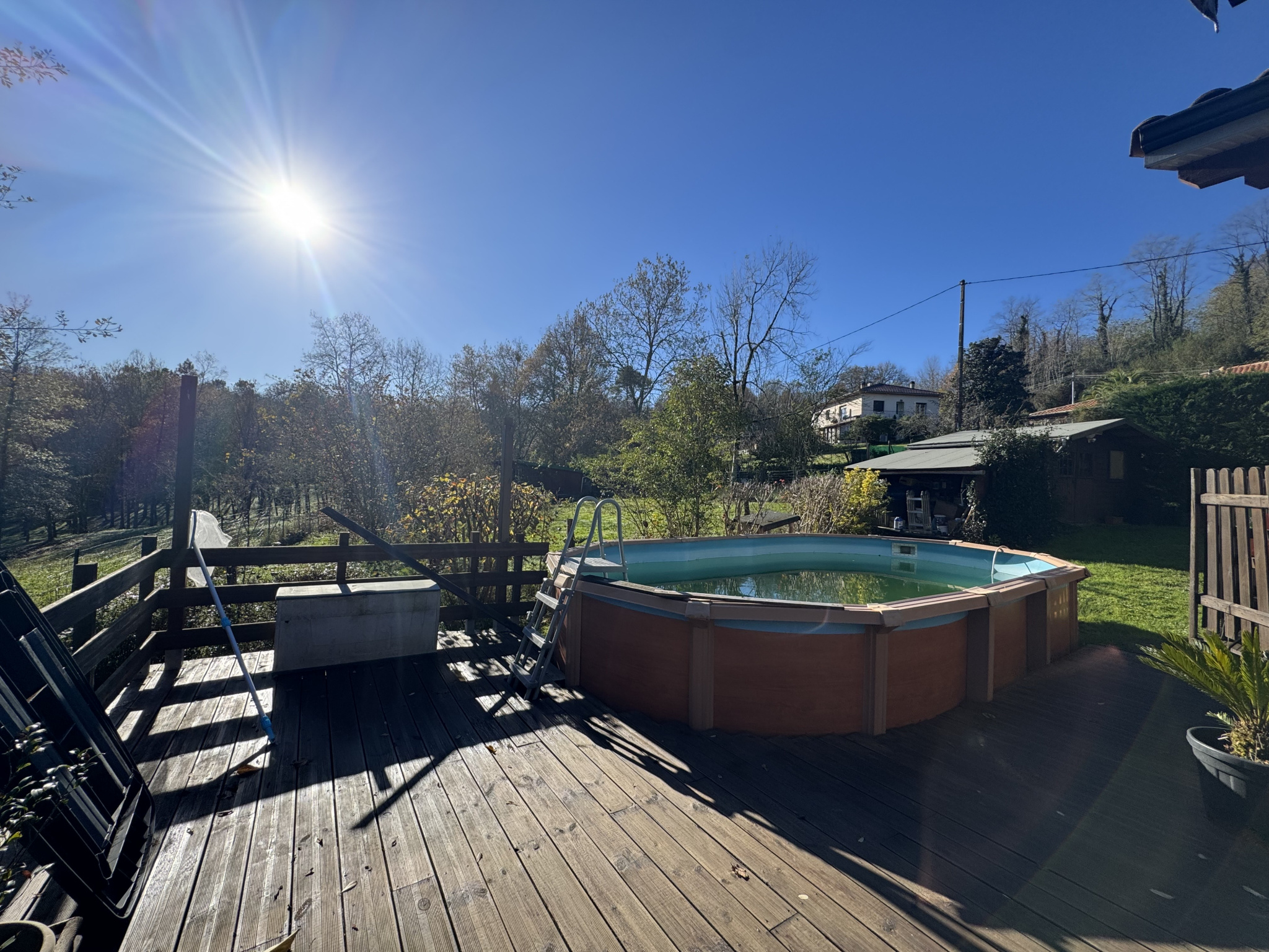 À l'extérieur, vous profiterez d'une piscine hors sol au sel, idéale pour les beaux jours, d'un carport pouvant accueillir deux véhicules ainsi que d'un abri de jardin pour le rangement.