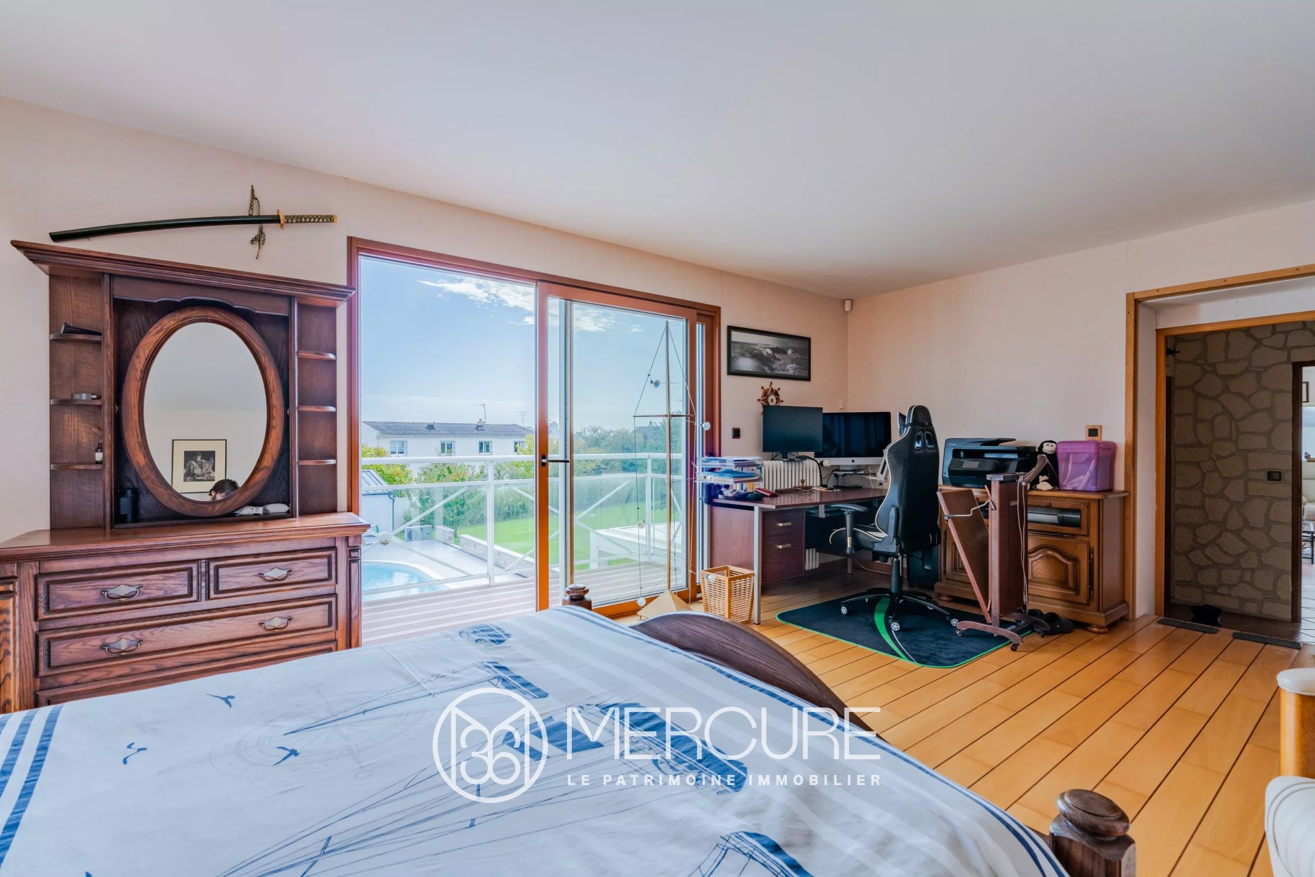 Dès l'entrée, la pièce de vie ouverte avec cheminée séduit par sa triple exposition et son balcon donnant sur la piscine.