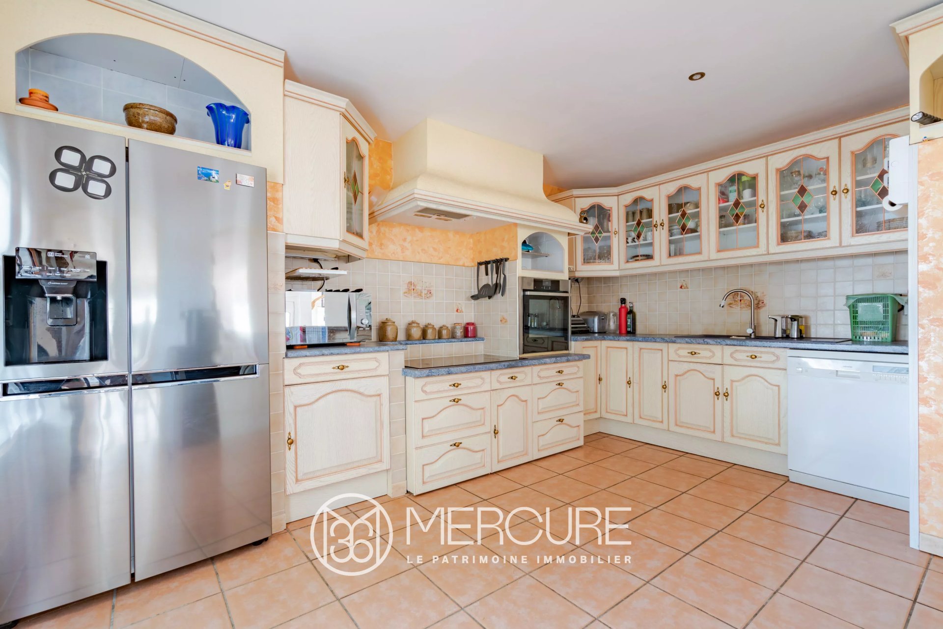 La cuisine fonctionnelle et aménagée est contigüe, équipée d'un monte-charge pour faciliter la gestion des courses depuis le garage.