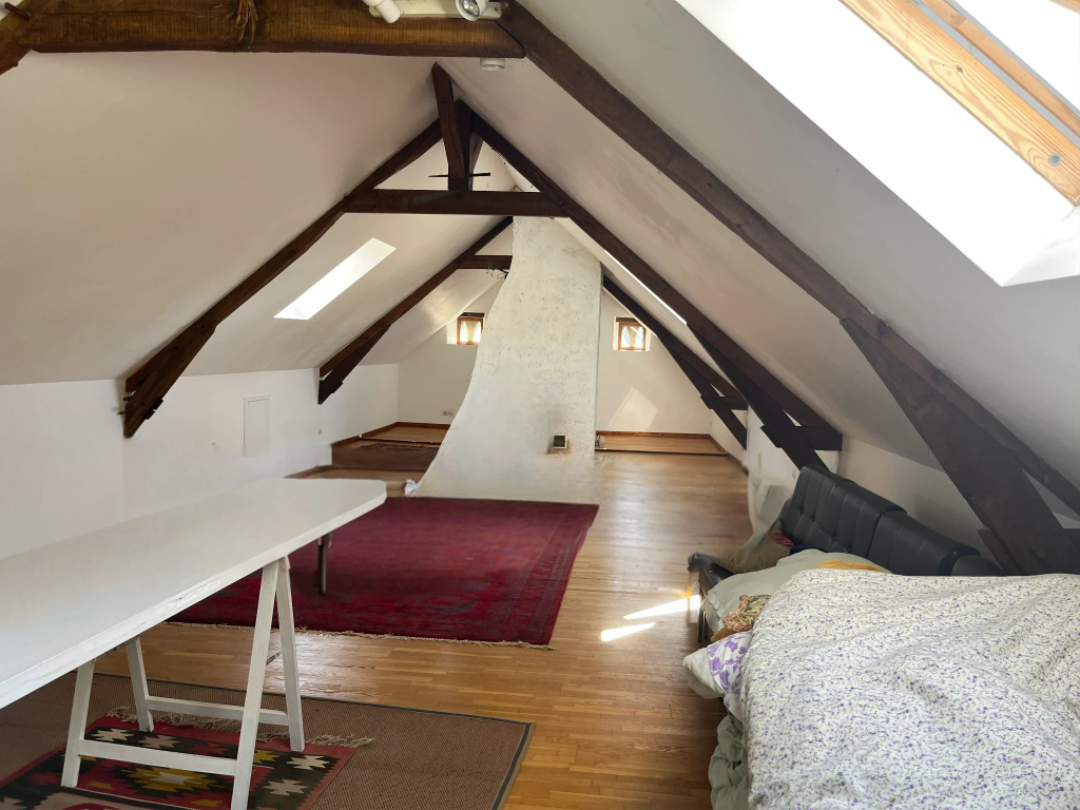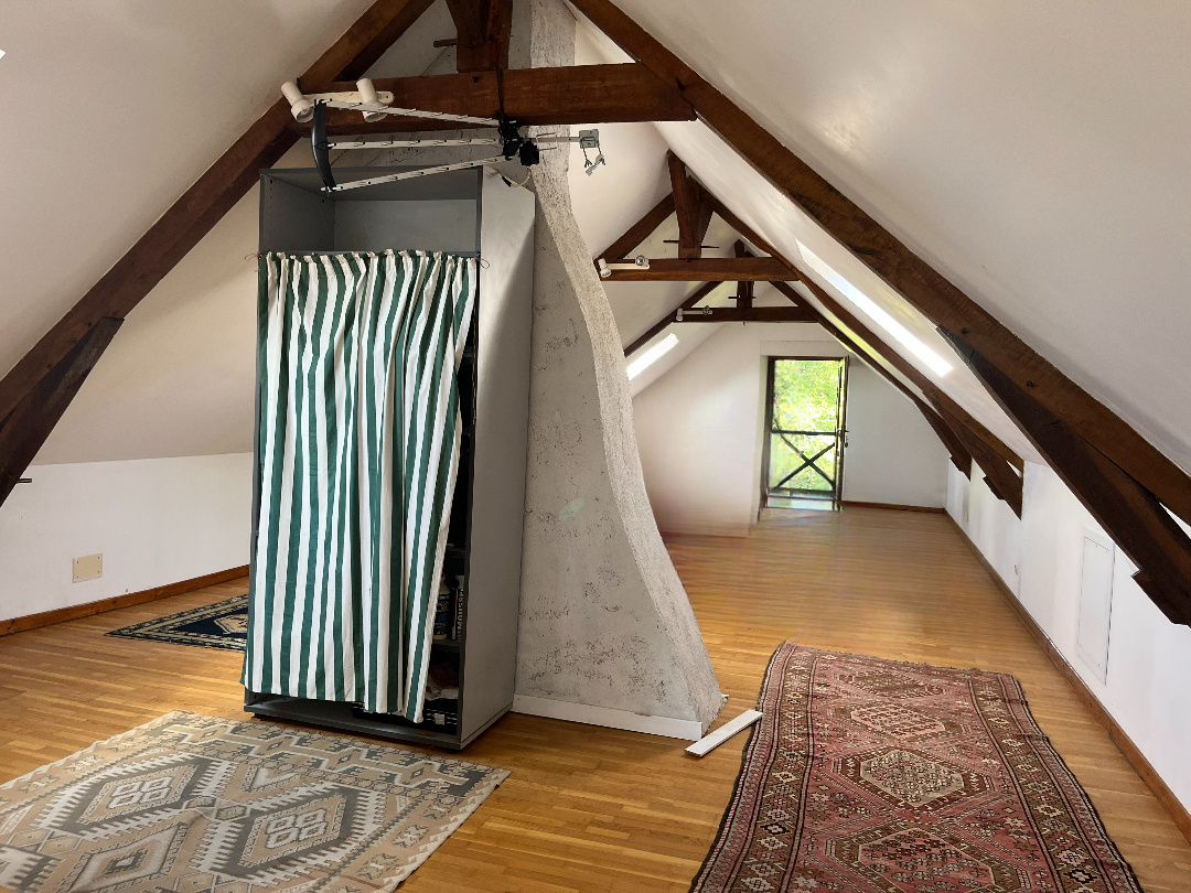 À l'étage, accessible par un escalier depuis l'extérieur, se trouve une grande chambre offrant un espace paisible et privé.