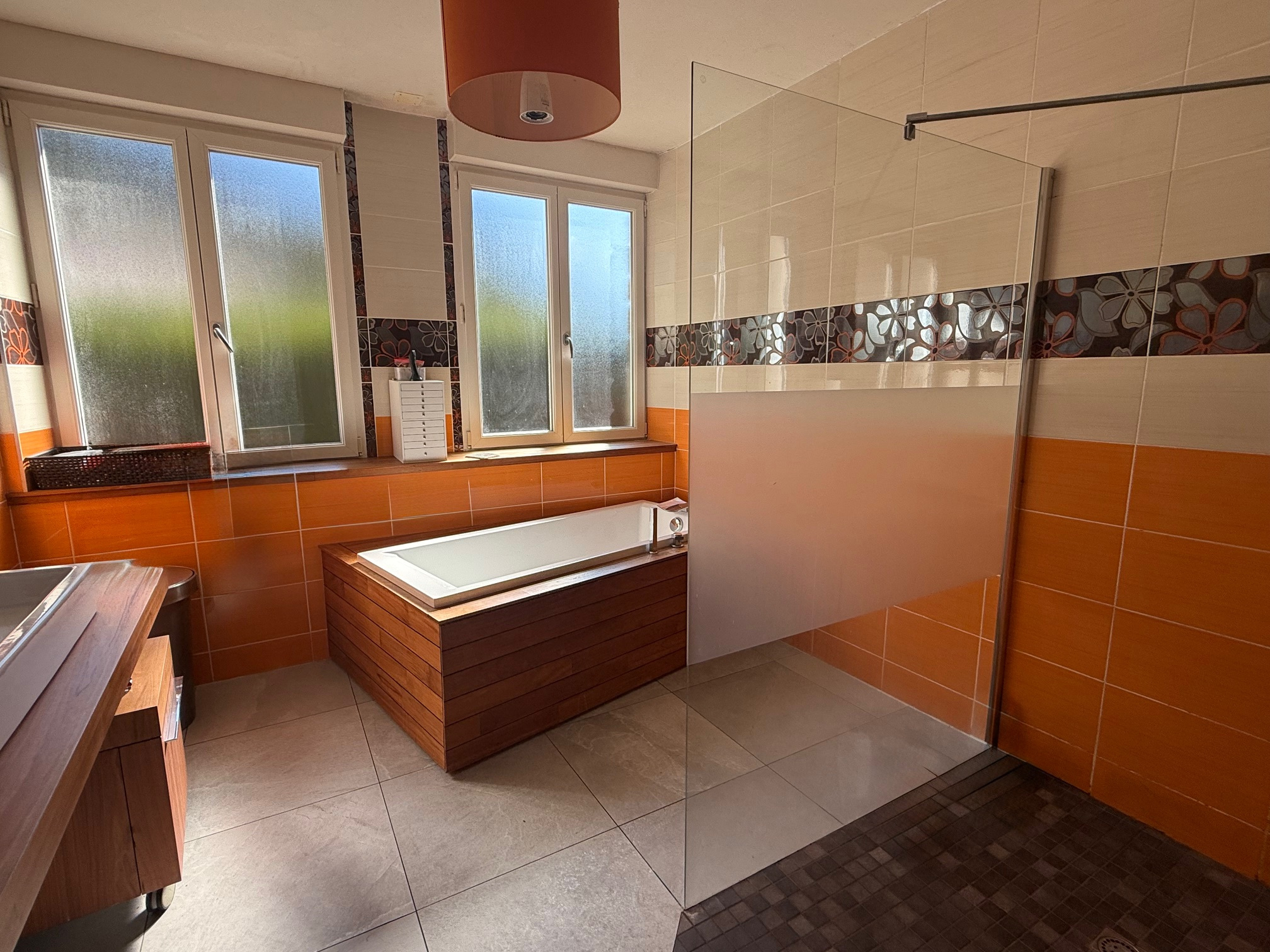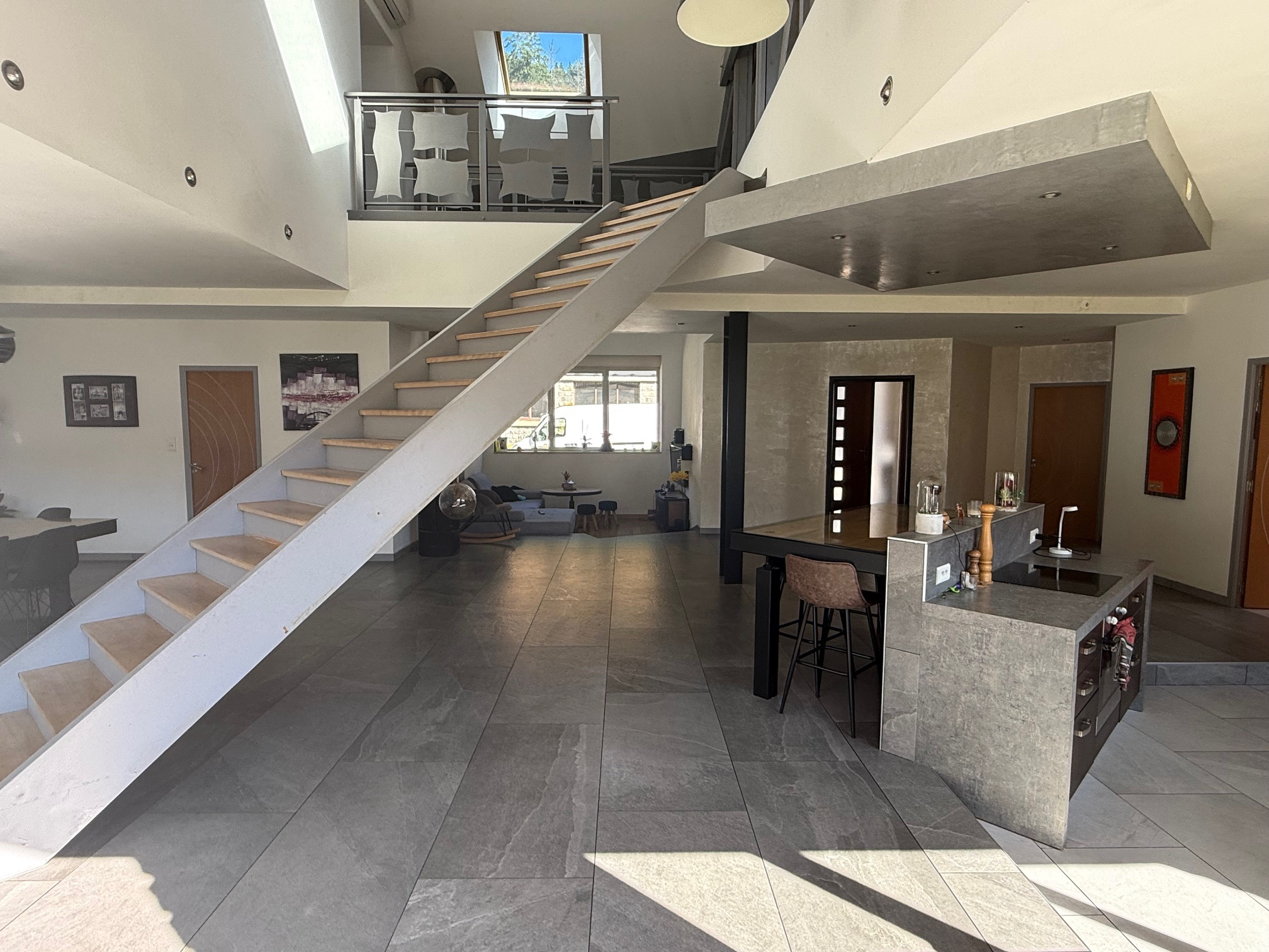 À l'étage (accès par escalier central) : mezzanine et passerelle desservant 3 chambres, dont une suite parentale avec salle de douche, wc et dressing.