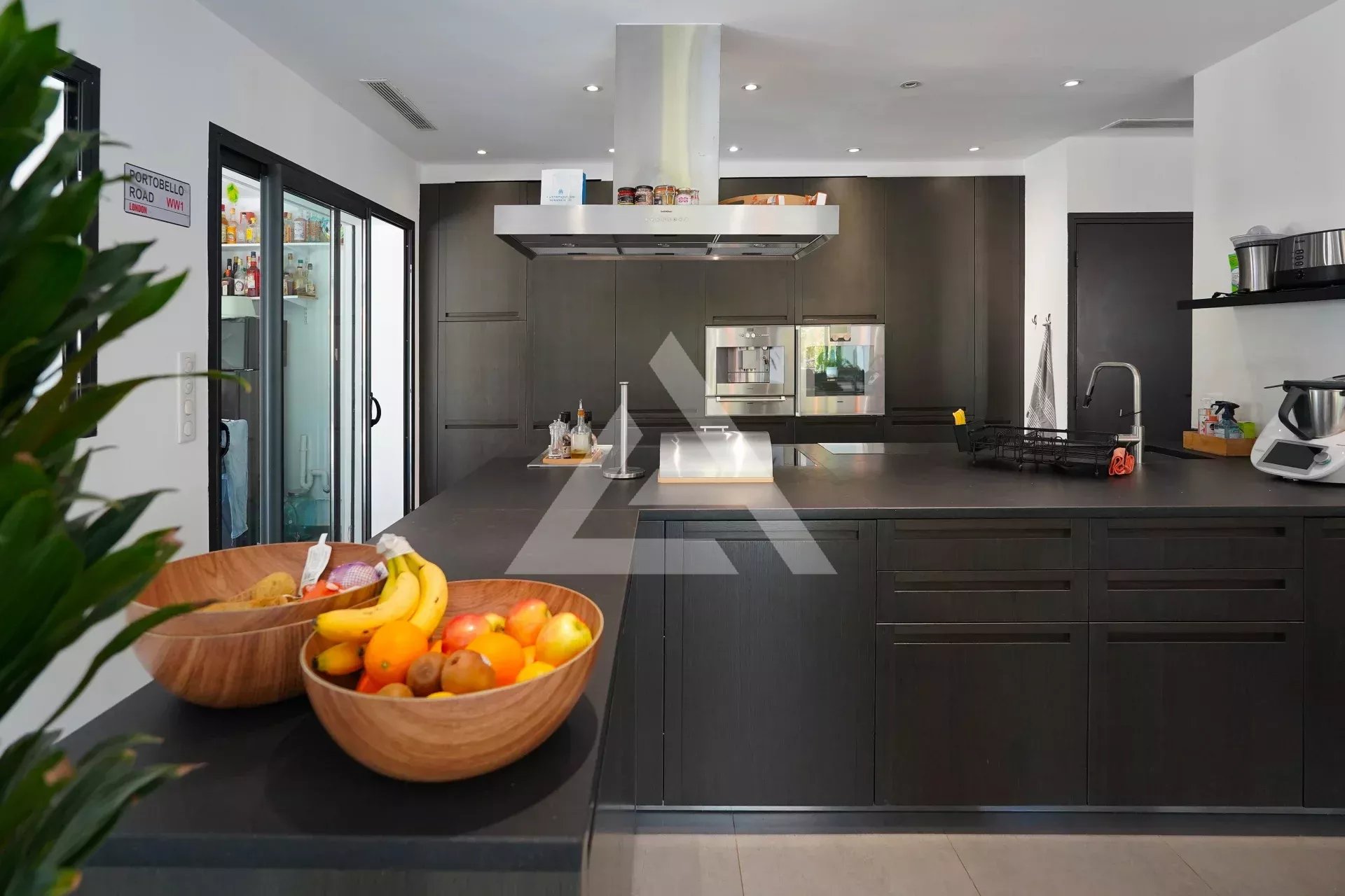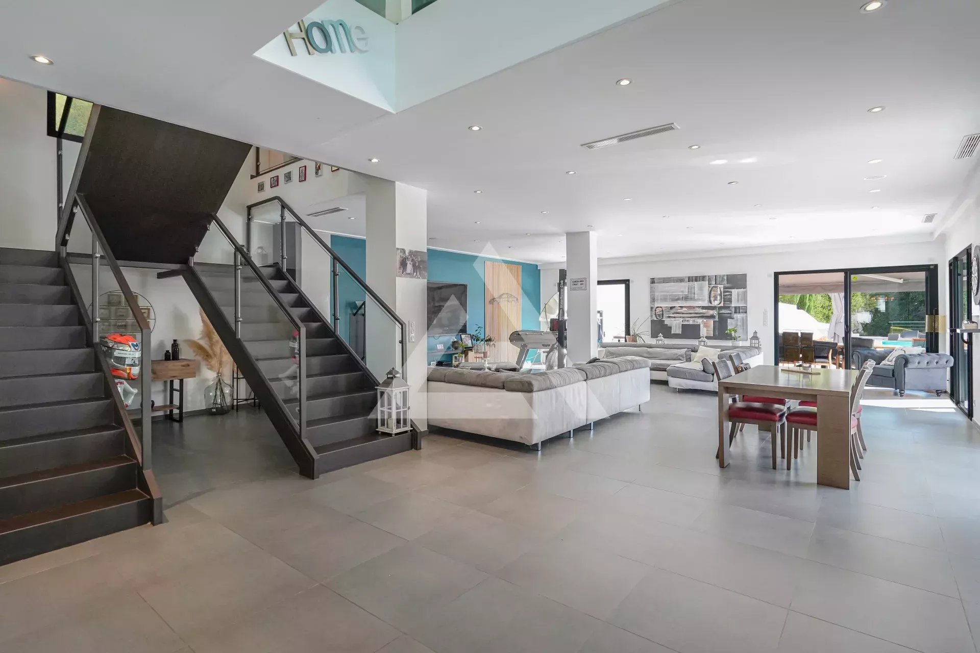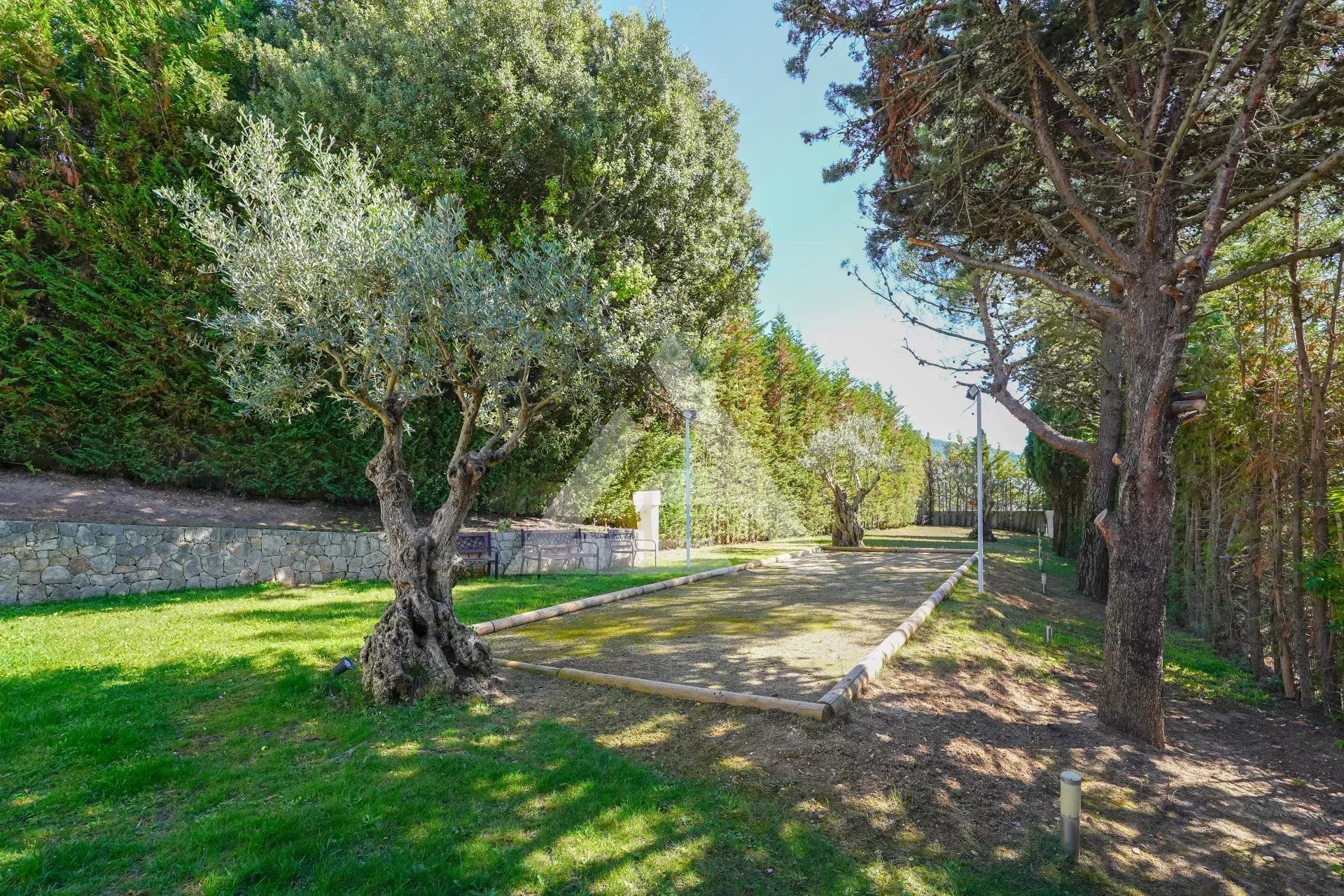 Les extérieurs séduisent par un jardin paysager plat avec piscine chauffée, terrain de pétanque, arrosage automatique et panneaux solaires.