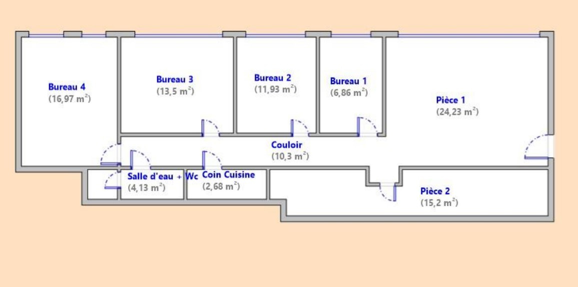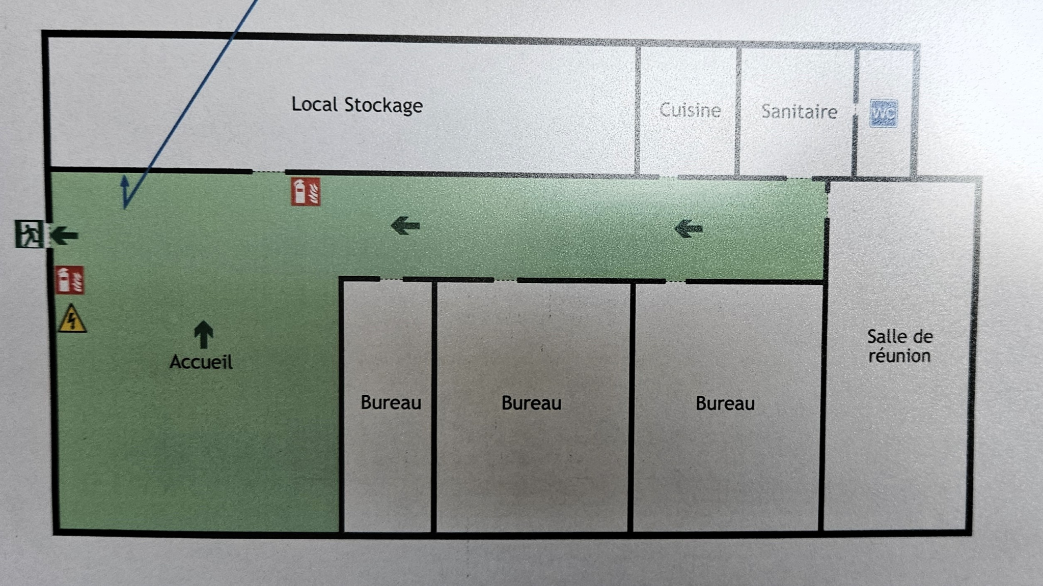 Le local est composé d'un accueil spacieux de 24 m2, d'un local de stockage de 17 m2, de trois bureaux (7 m2, 12 m2 et 14 m2), d'un bureau supplémentaire de 7 m2, d'une salle de réunion de 17 m2, d'un couloir de distribution de 11 m2, d'une kitchenette de 2,5 m2 et d'un WC avec sanitaires de 4 m2.