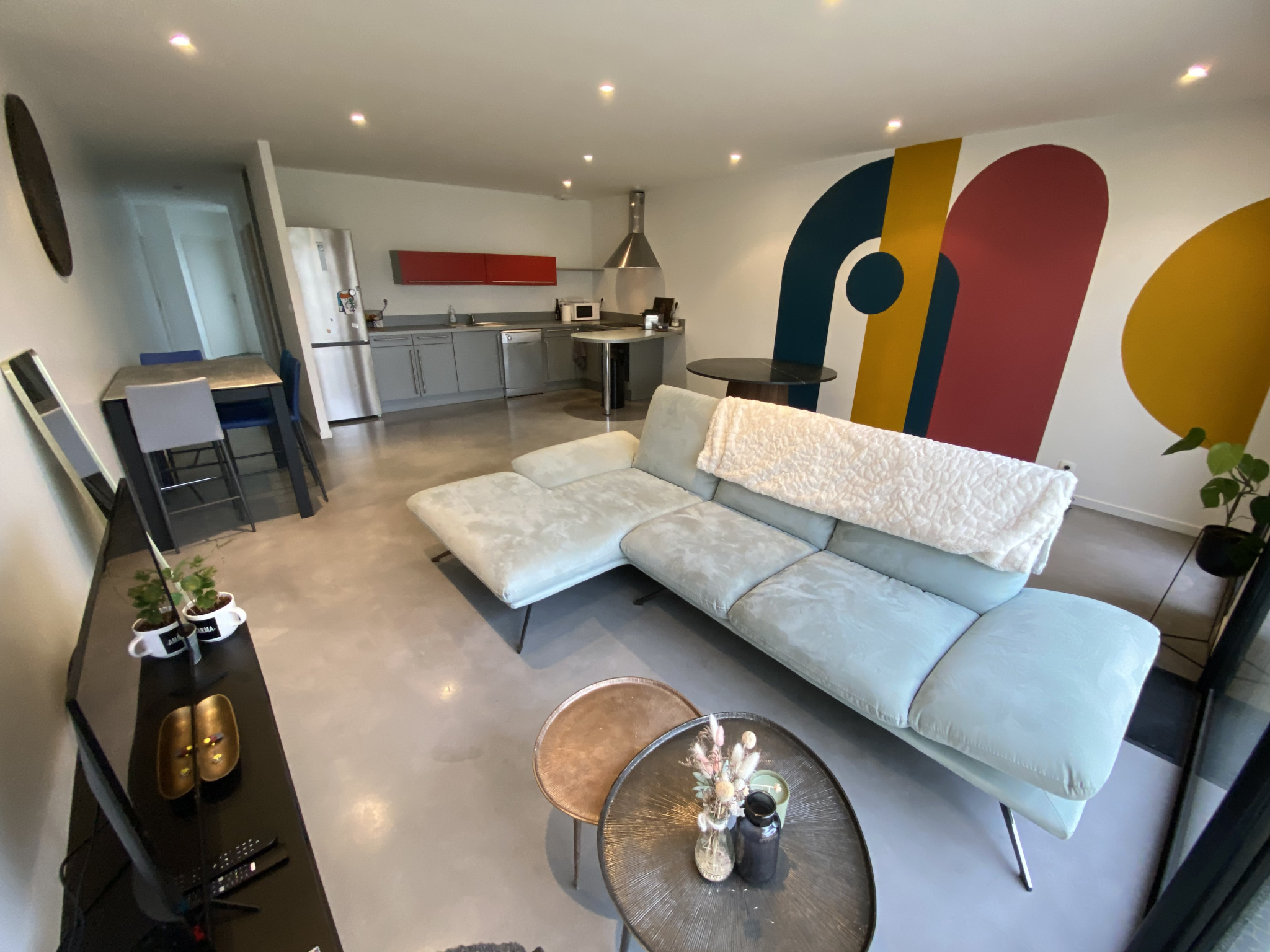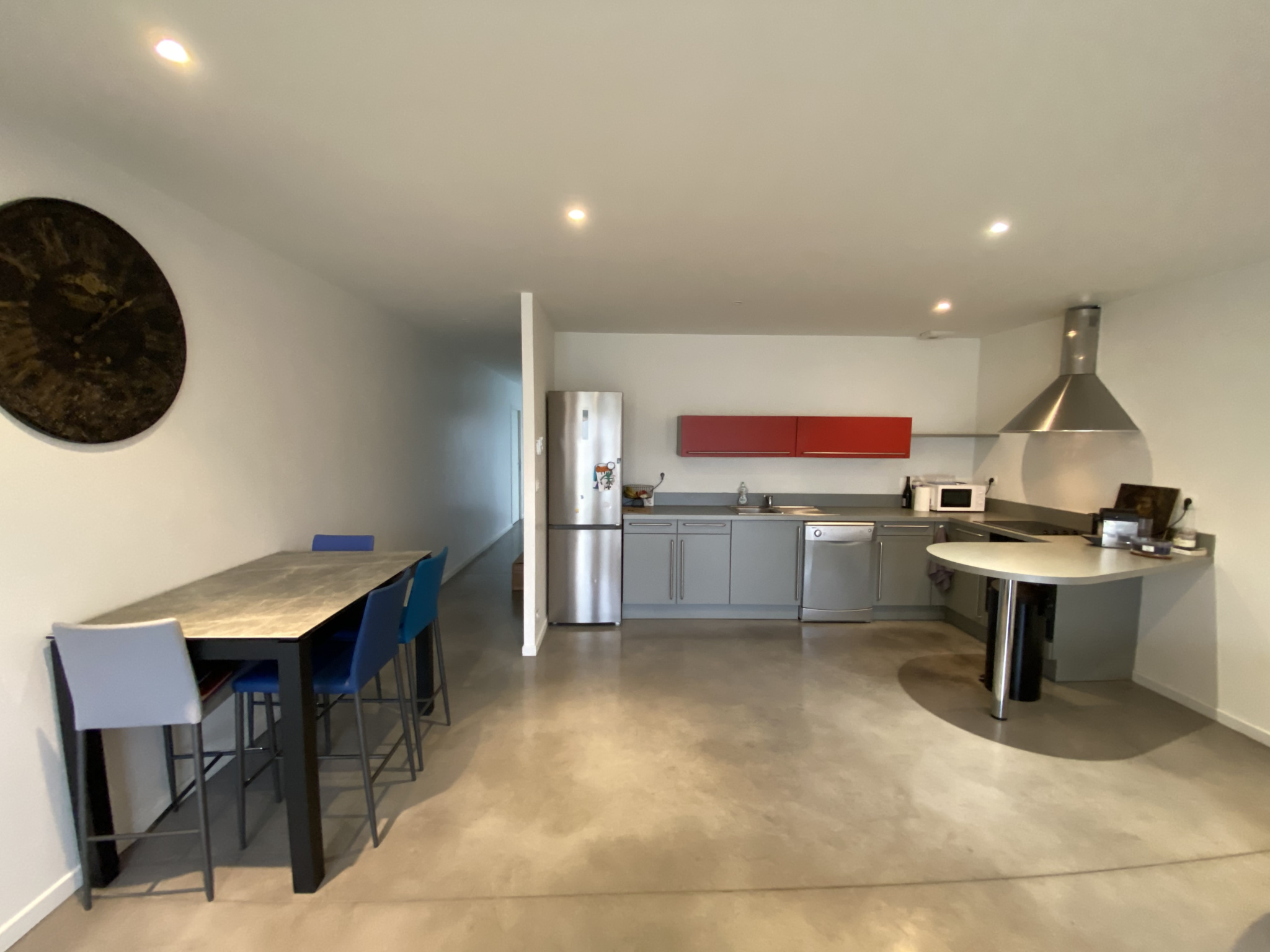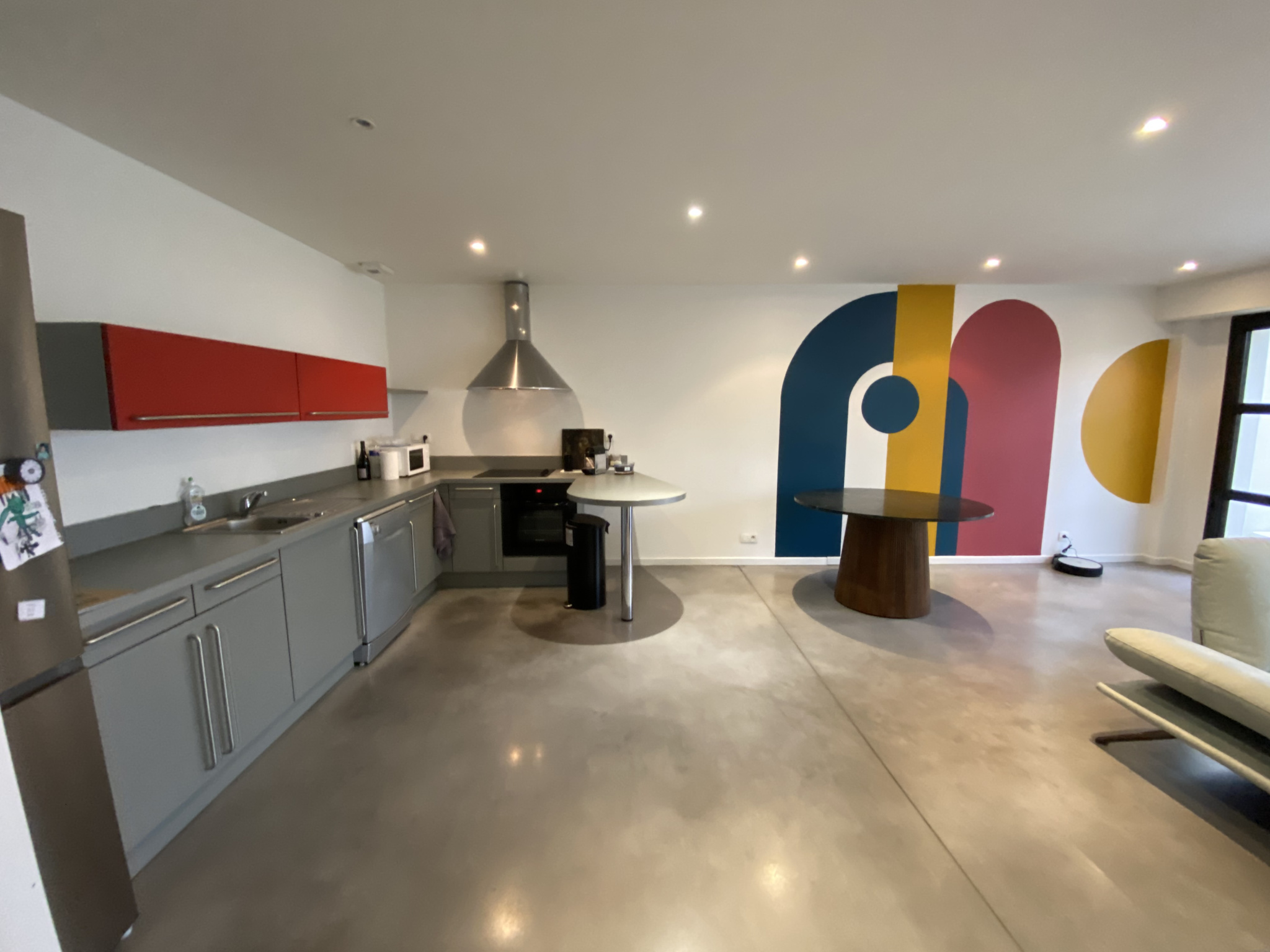 - une entrée avec un placard, une pièce de vie lumineuse (41,15m2) sur un joli sol en béton ciré, avec une cuisine ouverte aménagée-équipée (plaque de cuisson, four, hotte, lave-vaisselle), le tout donnant sur une terrasse (17m2) avec un jardinet clôturé orientation Sud.