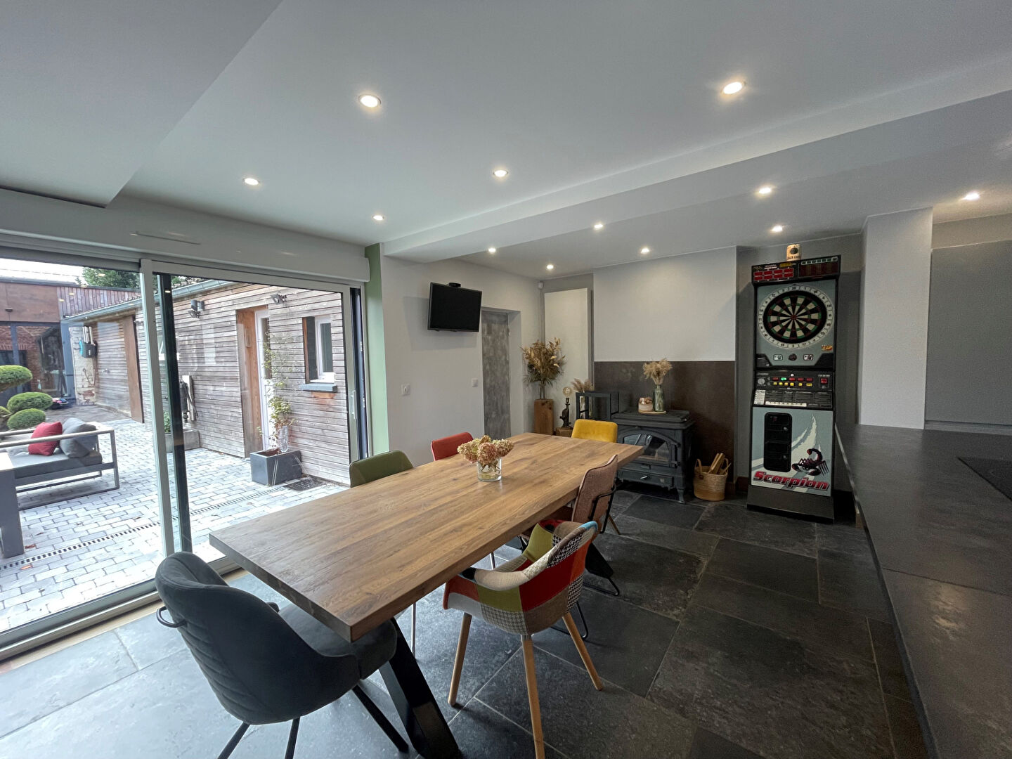 On y retrouve en lieu et place d'un ancien estaminet, un très beau salon d'antan, coin cinéma avec espace jeux, une cuisine avec ilot central tourné vers la salle à manger agrémenté de poêles à bois.