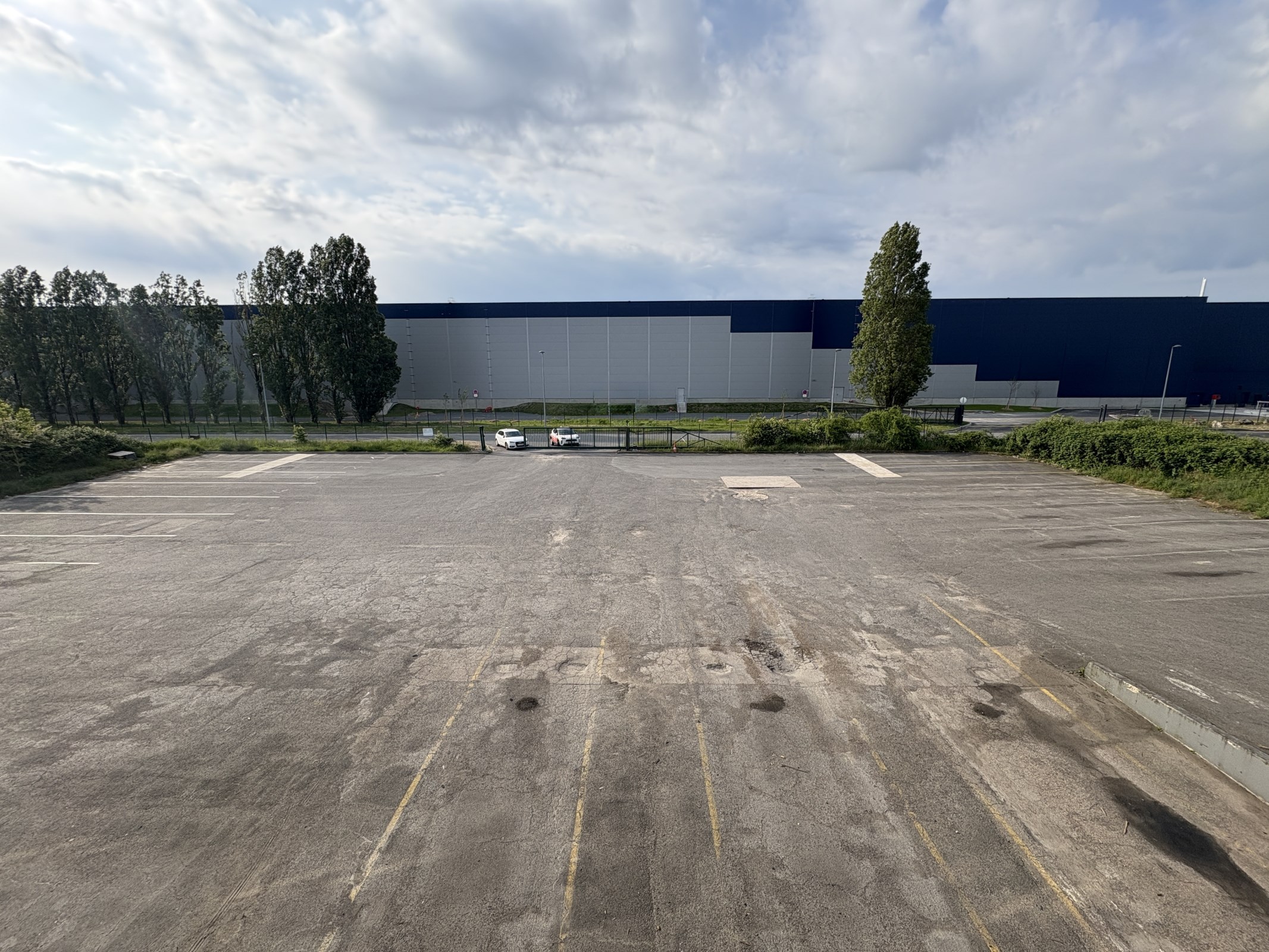 Grande cour en façade du bâtiment d'une surface d'environ 2 200 m2 en enrobée avec accès sécurisé par portail.