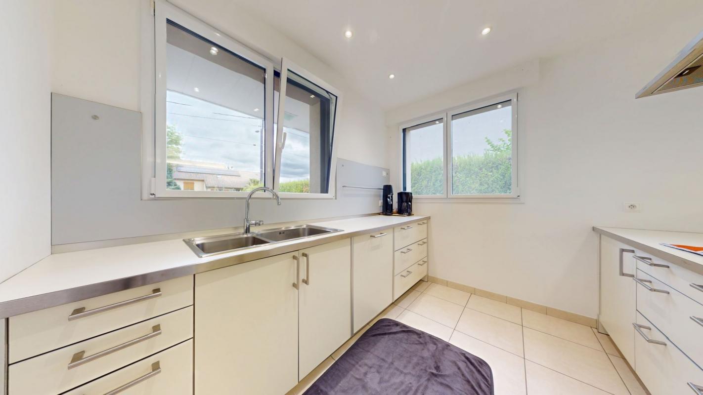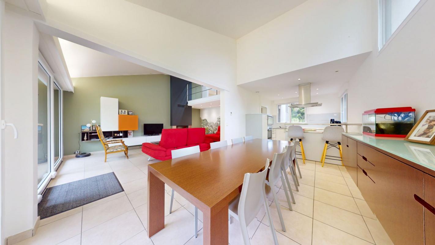 À l'intérieur, les volumes se déclinent en demi niveaux, offrant une belle dynamique architecturale. Le salon, baigné de lumière grâce à deux grandes baies vitrées exposées ouest, bénéficie d'un plafond cathédrale pour une atmosphère chaleureuse et ouverte.