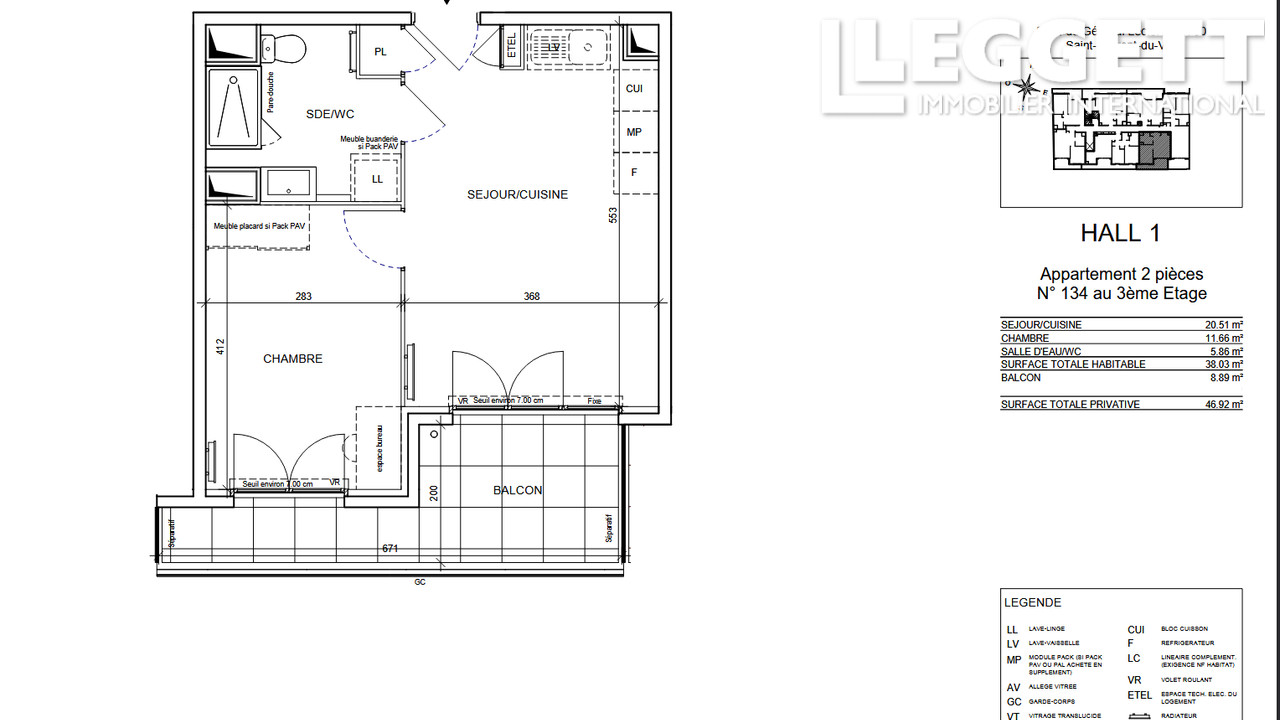 Le séjour et la chambre ont accès au balcon de 9 m². Vous bénéficiez d'un séjour de 20m² avec cuisine ouverte (à équiper), de 1 chambre, d'une salle d'eau avec un WC.