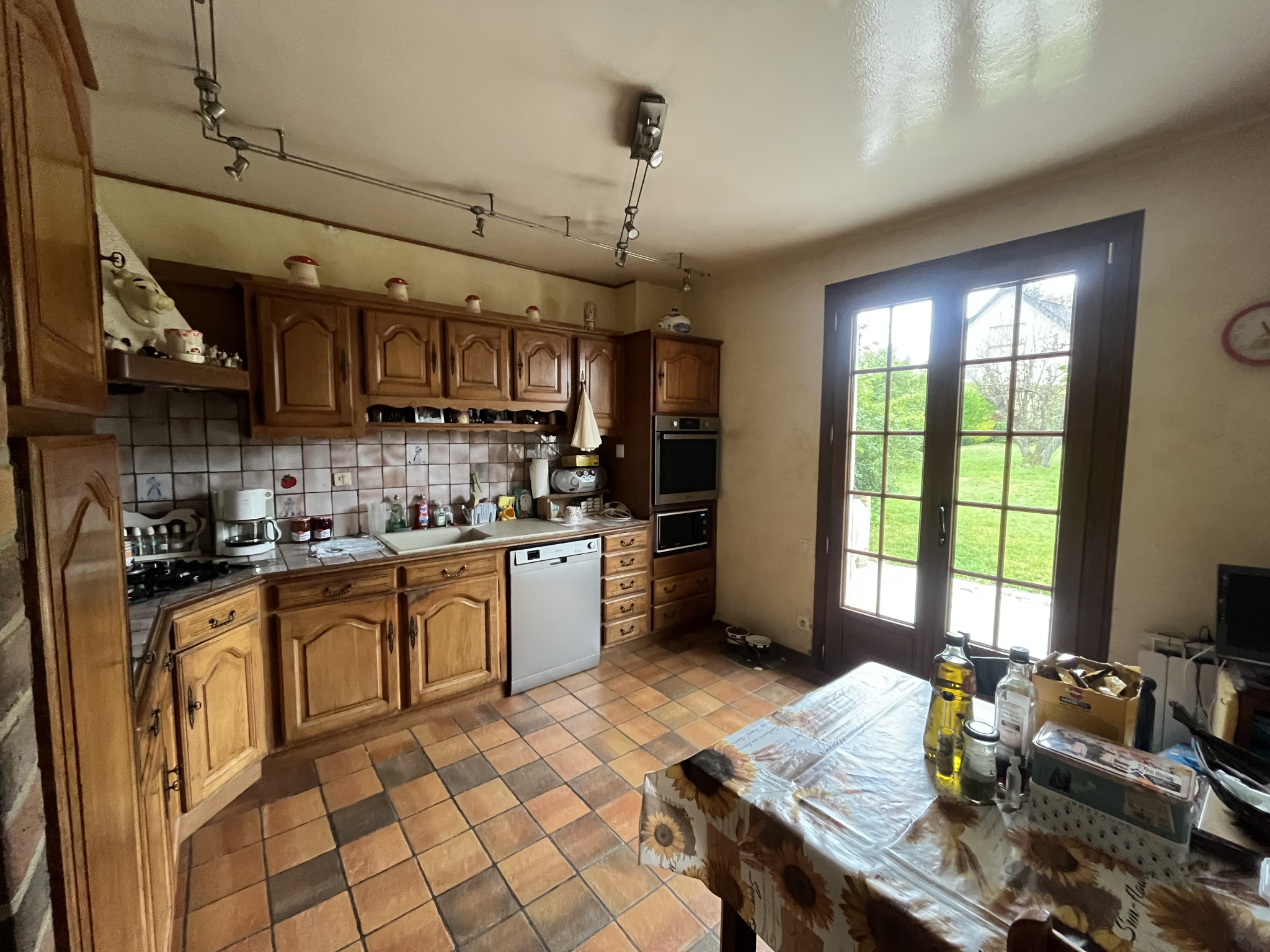 Au rez-de-chaussée: Entrée avec grand placard, cuisine aménagée avec four, plaque de cuisson ,hotte, réfrigérateur, salle salon avec insert (40 m2), chambre bureau.