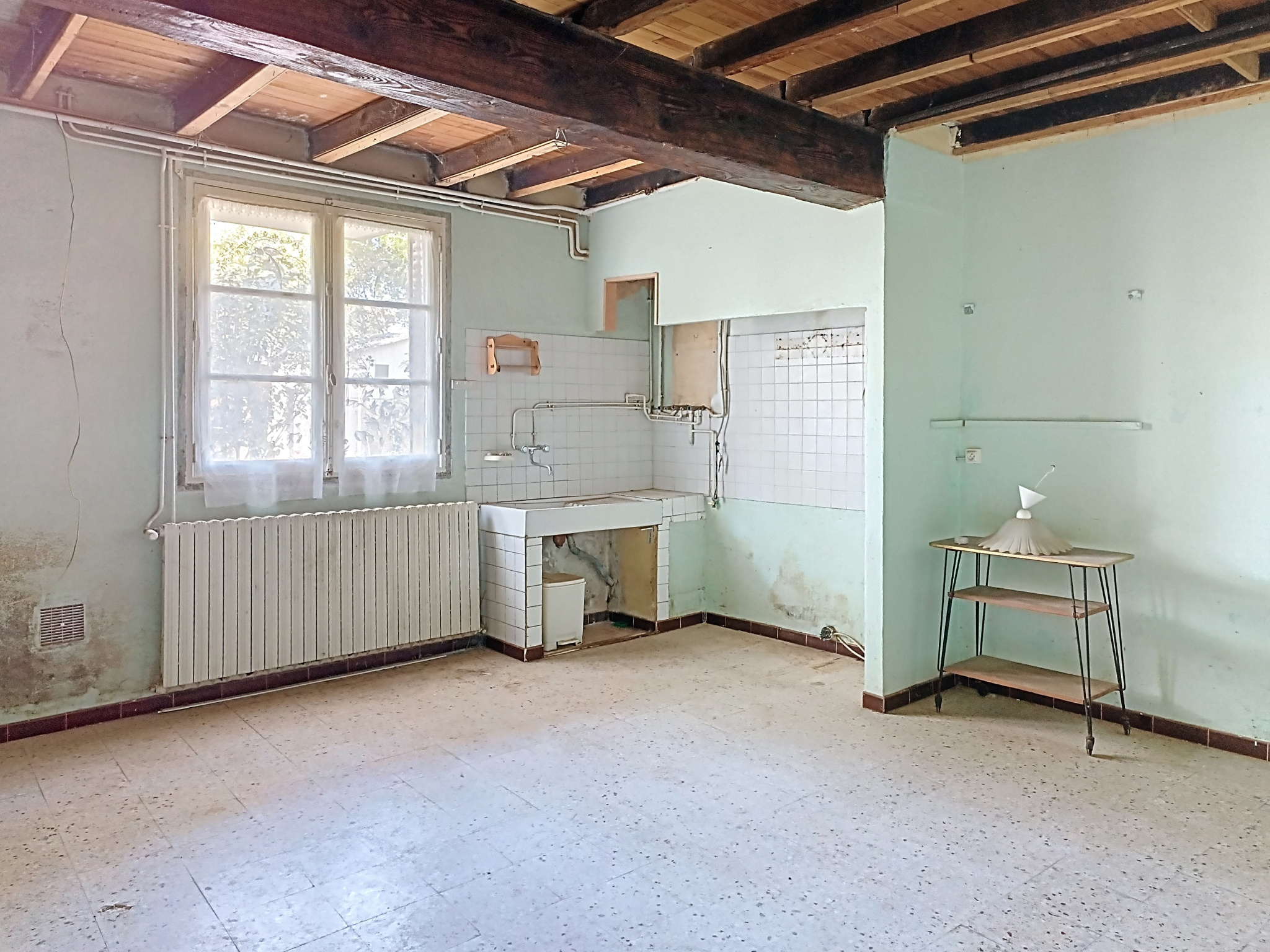 Elle dispose en rez-de-chaussée, d'une entrée, une chambre avec cheminée ancienne, un cellier/buanderie, une cuisine, un atelier pouvant être transformé en salon avec belle hauteur sous plafond.