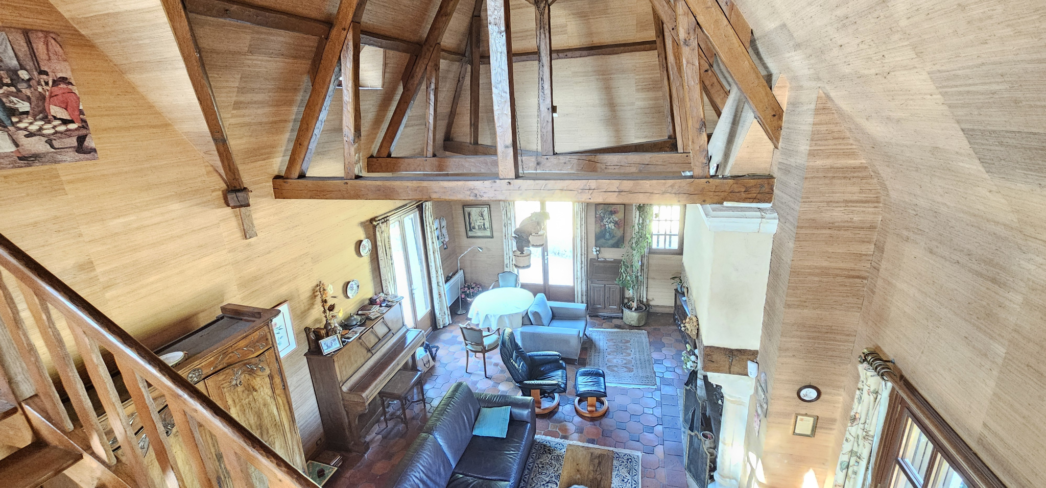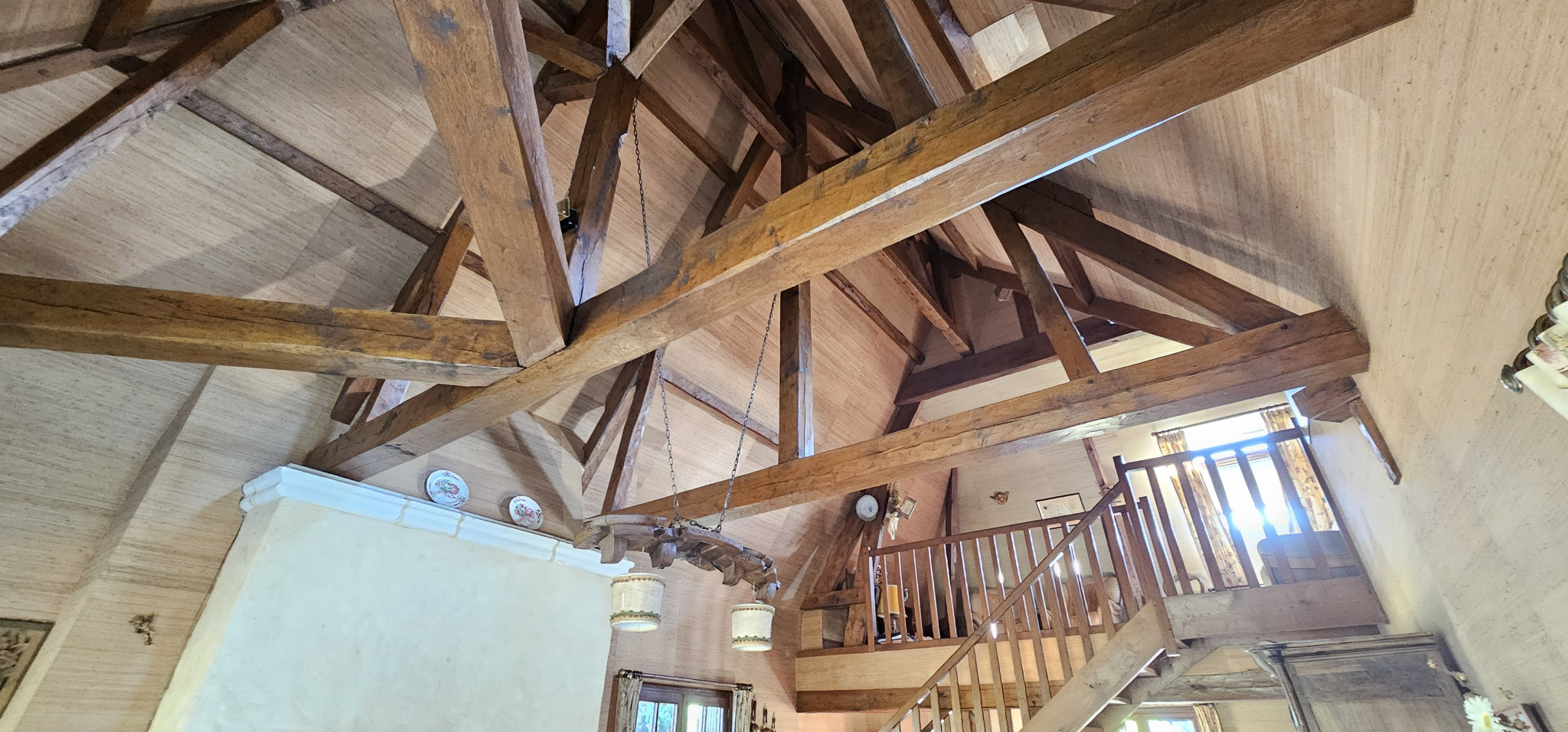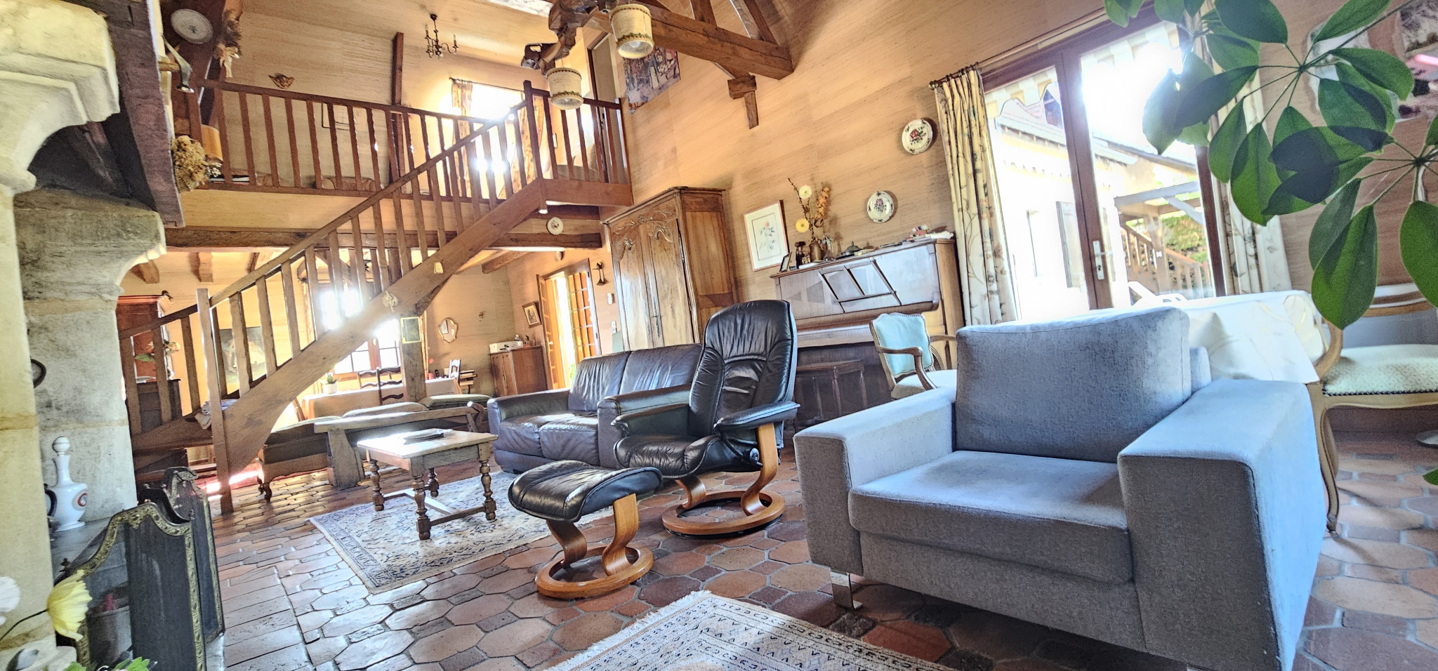 L'espace de vie principal séduit immédiatement : un salon cathédrale de 50 m2, baigné de lumière, avec charpente apparente, hauteur sous plafond généreuse et cheminée authentique. L'ensemble donne le ton d'un lieu chaleureux, aux volumes aérés et pleins de potentiel. La cuisine est séparée, attenante à un cellier pratique. Le rez-de-chaussée compte également une entrée, un dégagement avec placards, des WC séparés, ainsi qu'une chambre avec salle de bains.