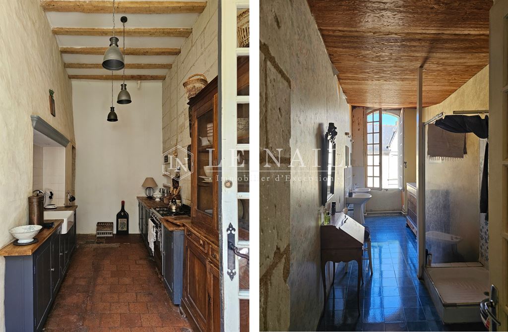 Au premier étage : une longue galerie mène à six chambres, dont une avec dressing, une lingerie et deux salles d’eau. À cet étage, les sols sont en parquet, tomette, carrelage et jonc de mer, et les éléments décoratifs, cheminées en tuffeau, boiseries de hauteur ornées et poutres apparentes.