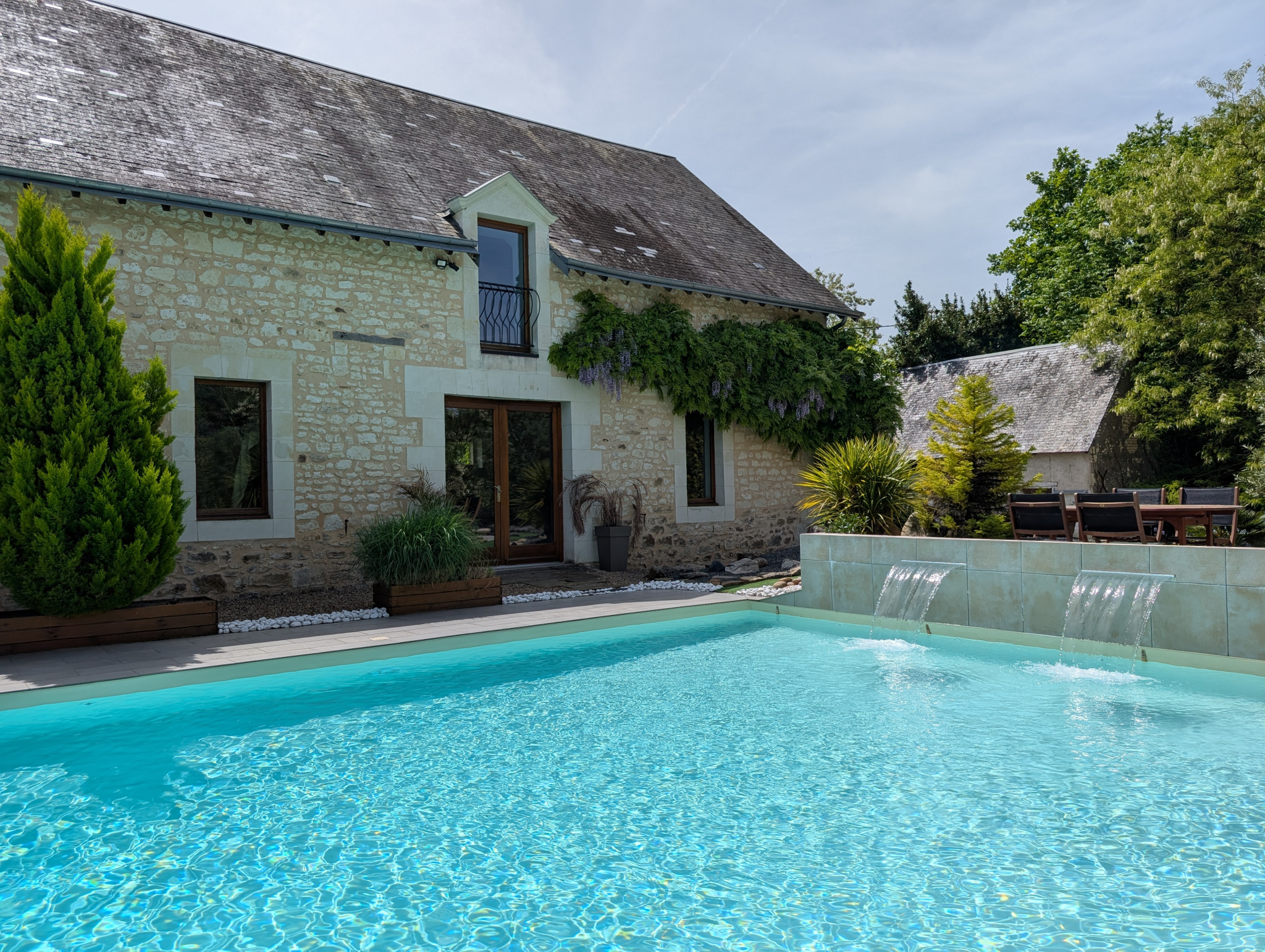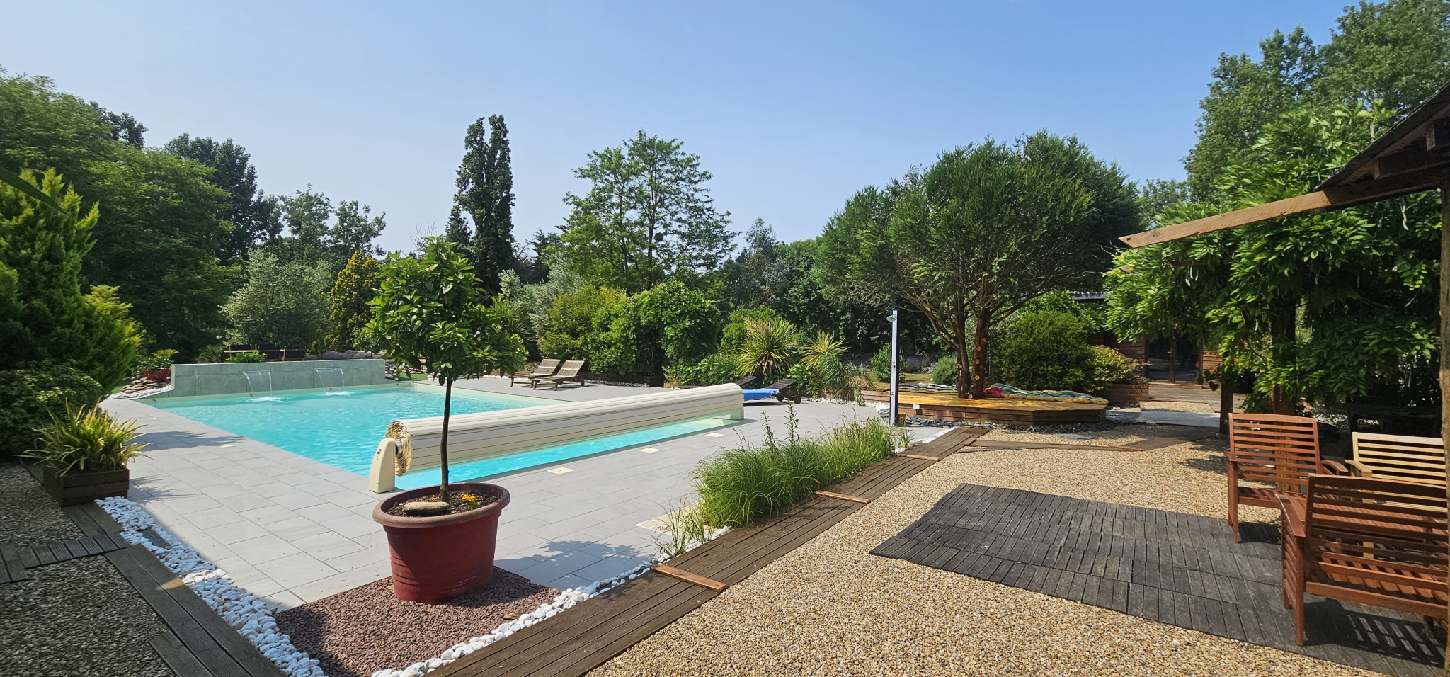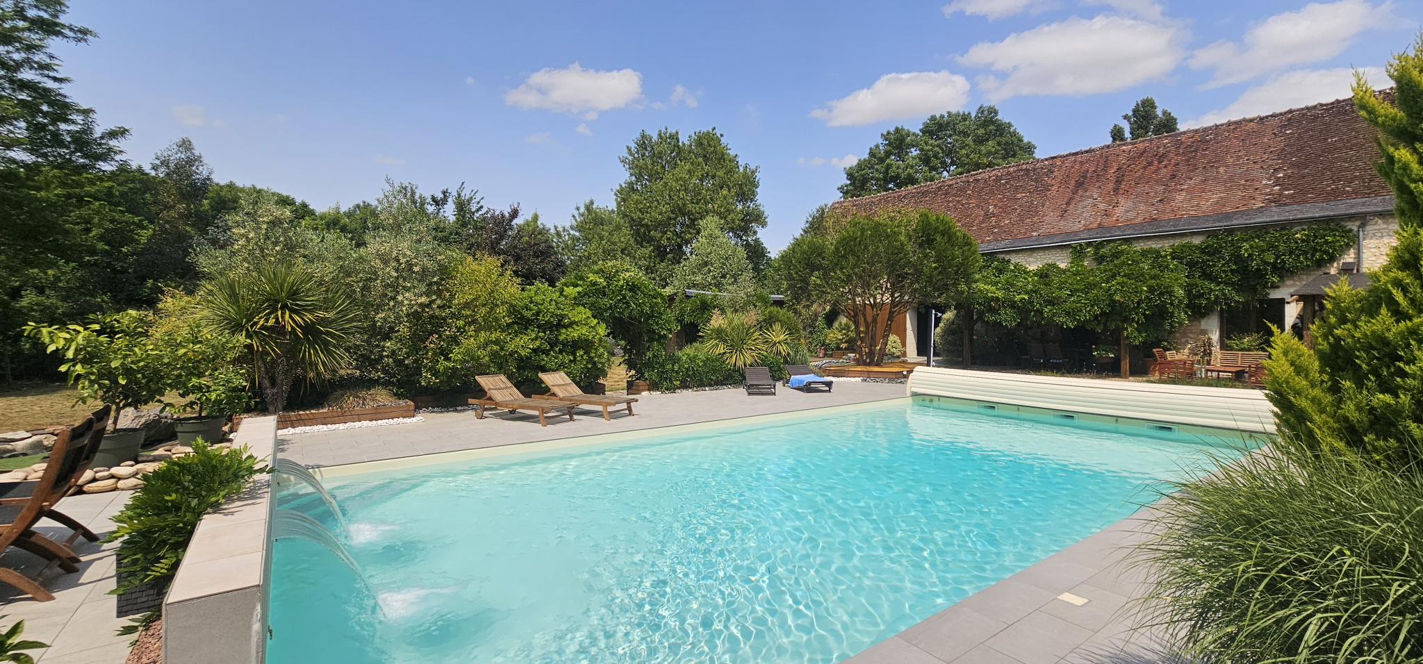 Le tout est sécurisé par un système de vidéo-surveillance, et une dalle béton accessible PMR entoure la piscine avec une gestion efficace des eaux pluviales. Les espaces aménagés dans les parties libres du terrain permettent d'envisager facilement l'installation de structures complémentaires type chalets, tiny houses ou hébergements insolites.