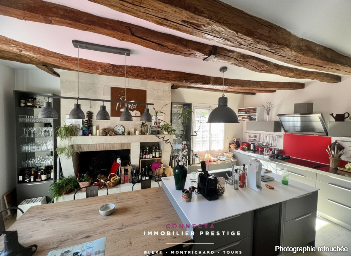 Rez-de-chaussée : un hall d'entrée accueillant ouvre sur une vaste cuisine aménagée et équipée, sublimée par une cheminée en pierre de Tuffeau, un salon, spacieux et lumineux, dispose également d'une cheminée en pierre, une suite parentale avec salle de bains et douche, ainsi que des toilettes indépendants, un espace chaufferie et buanderie complètent ce niveau.