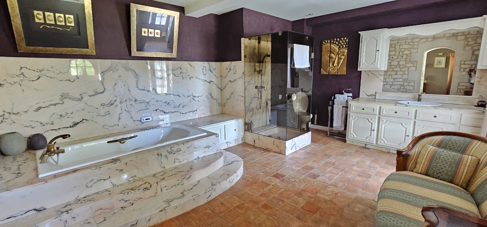 La bâtisse principale, une longère entièrement rénovée, développe plus de 450 m2 habitables. Au rez-de-chaussée, on découvre un hall d'entrée, une cuisine dînatoire aménagée et équipée (18 m2), une salle à manger (30 m2), un vaste salon de réception de 85 m2 avec cheminée d'époque ouvrant sur une belle terrasse plein sud, une suite de 25 m2 avec salle de bains et WC, une arrière-cuisine, une buanderie, un dégagement et des WC.