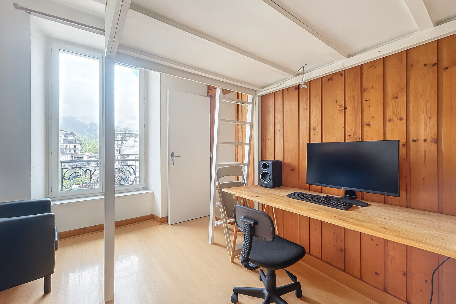Charmant appartement de 2 pièces au troisième étage d'une résidence historique, en plein coeur de Chamonix. Il se compose d'un vaste séjour avec kitchenette, d'une grande chambre, d'une salle de bains avec WC ainsi que d'un espace buanderie/dressing. Exposé Nord-Est, il offre une vue dégagée sur la place Balmat et l'Arve depuis le salon et la chambre.