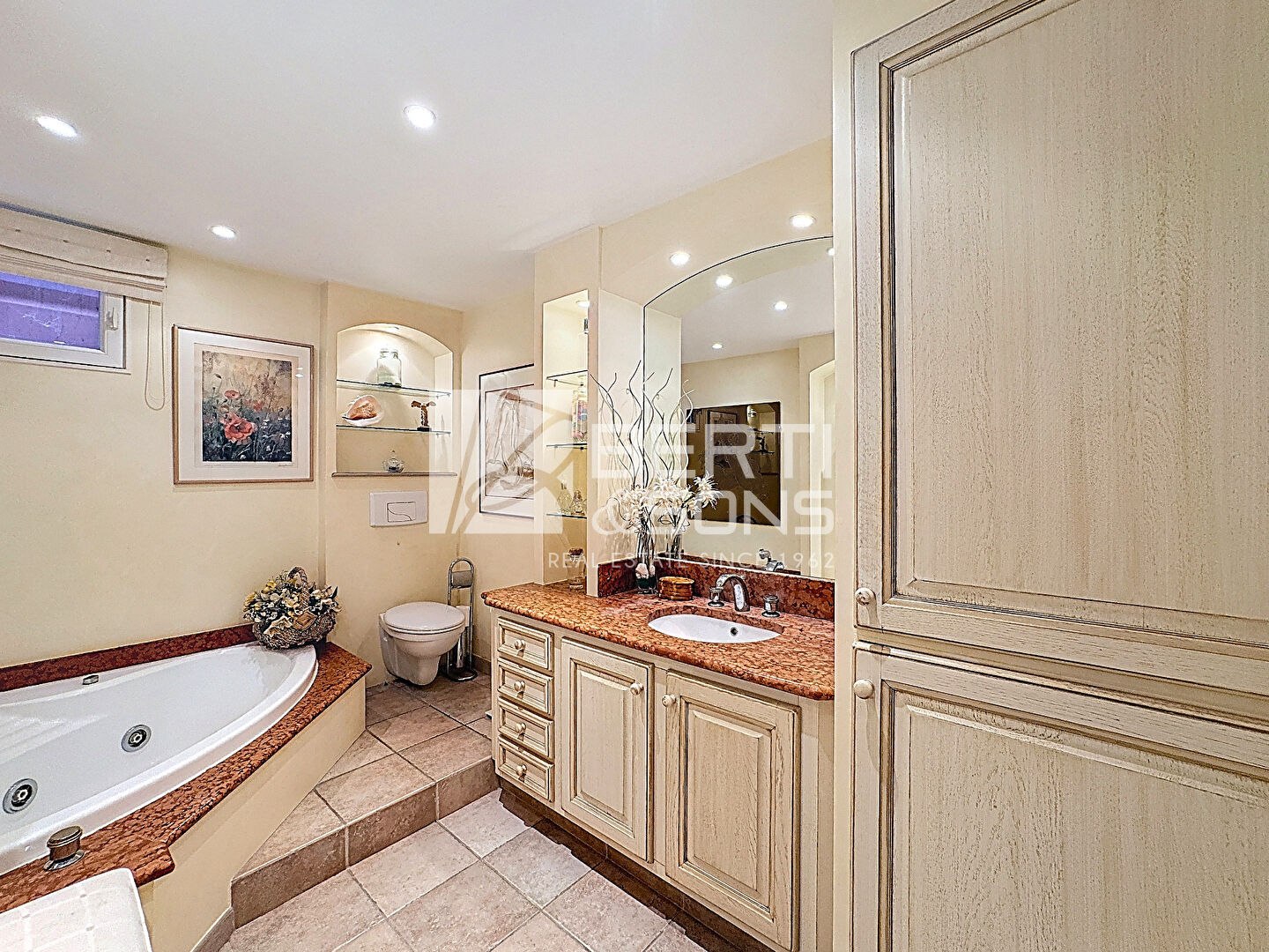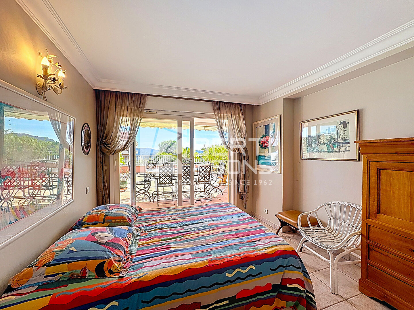 Le bien se compose d'une belle entrée avec rangements, un vaste séjour/salle à manger , une cuisine ouverte, WC invité, 2 chambres séparées et donnant sur une vaste terrasse de 76m² environ plein sud vue Esterel et aperçu mer. 1 salle de bains et 1 salle d'eau.