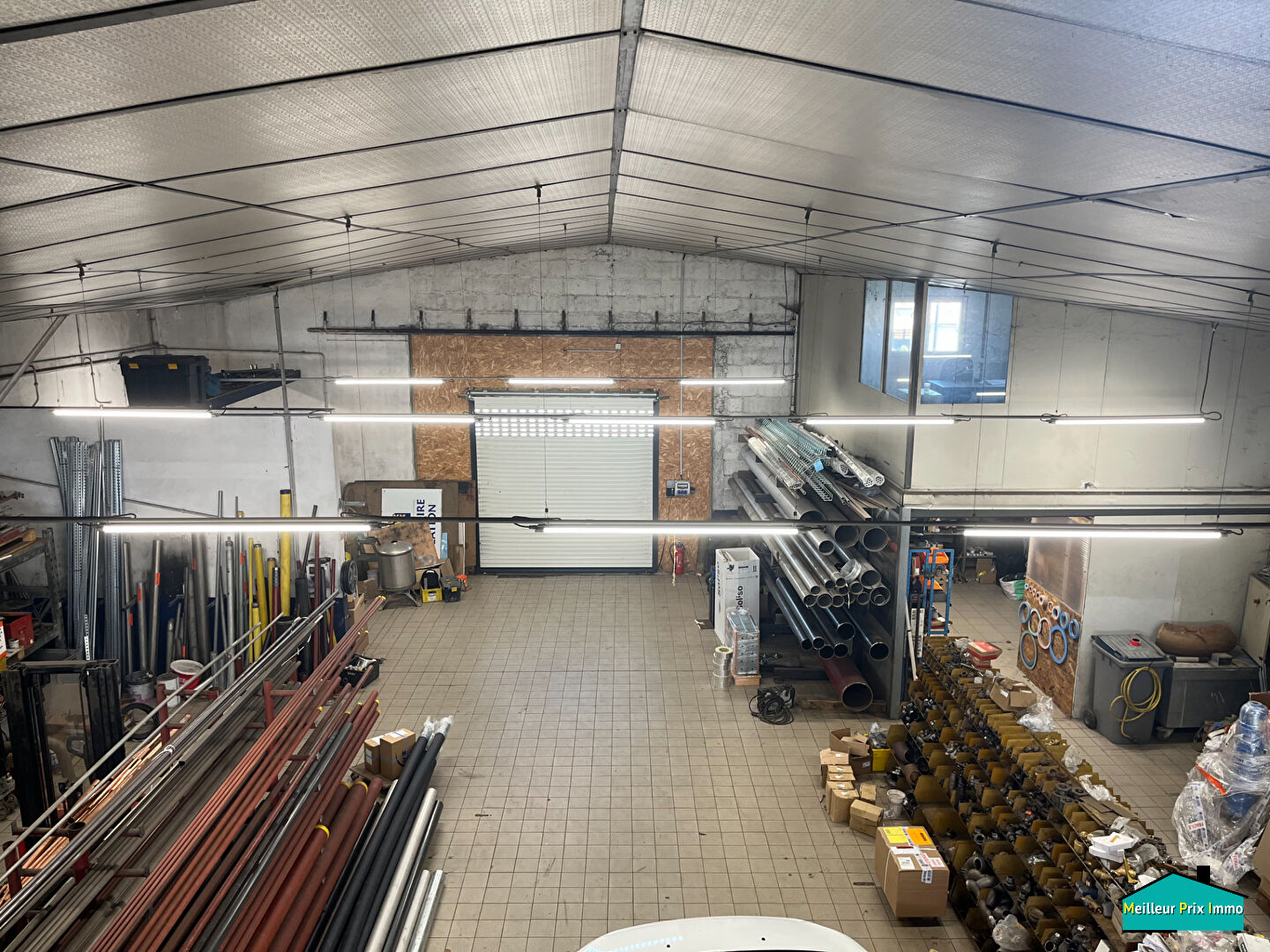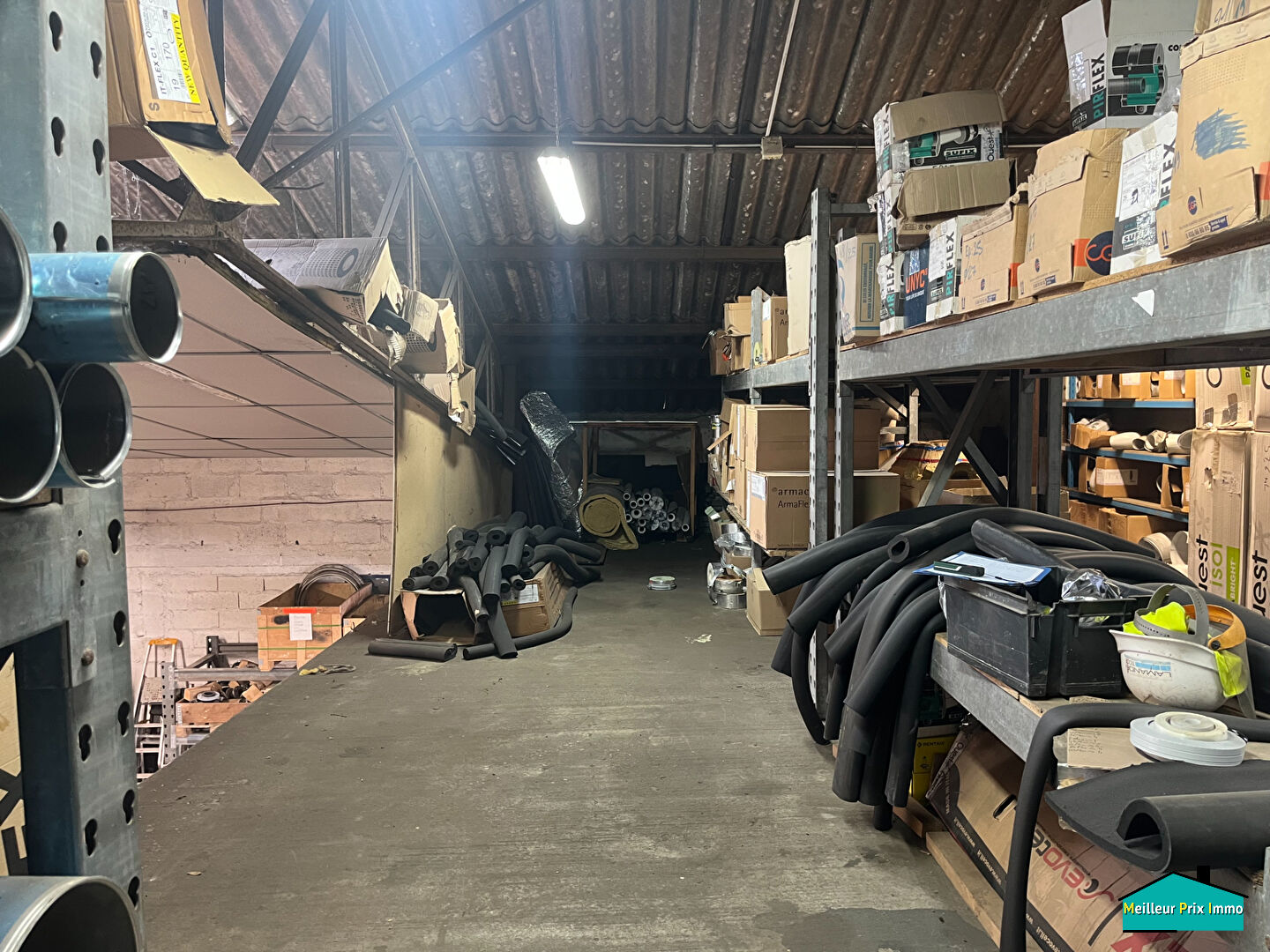 Charpente acier, toiture fibro, sol carrelage.
