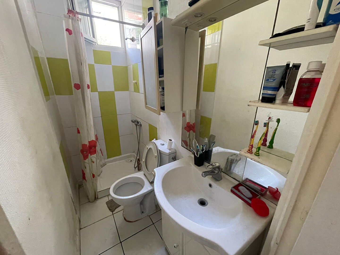 - Salle de bains avec WC : carrelée, équipée d'une fenêtre, d'un meuble vasque, et d'une douche.
