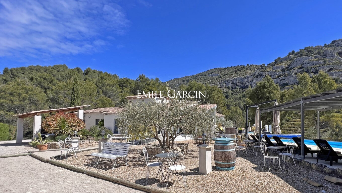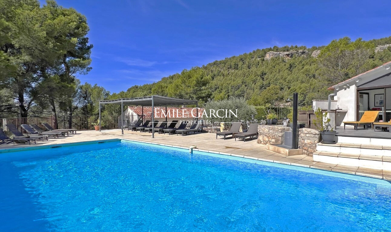 Édifiée sur un terrain paysager de 5 800 m², la propriété profite de nombreux espaces de détente et de deux piscines, dont une chauffée, pour savourer la douceur provençale en toute saison.