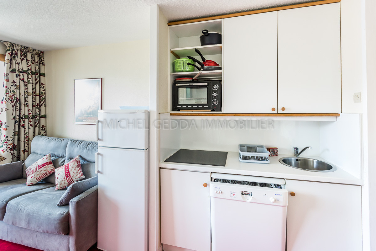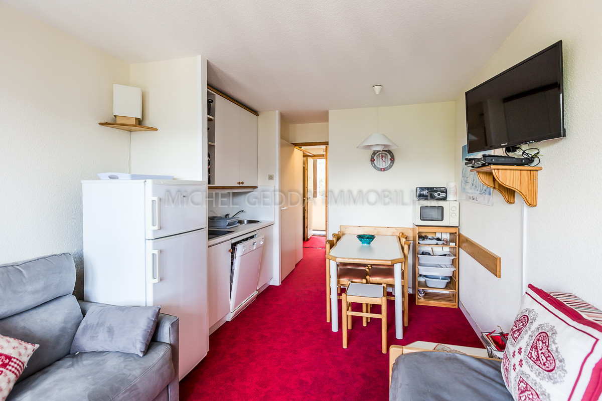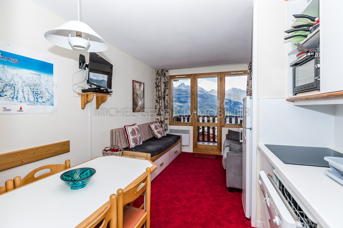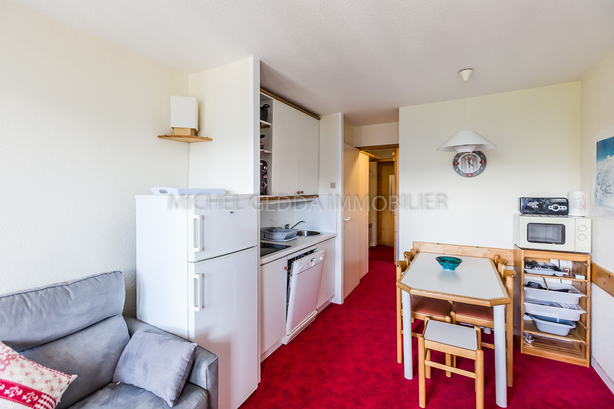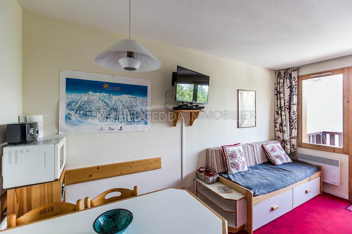 COMPROMIS EN COURS À L'AGENCE. Situé au c?ur de Paradiski, domaine La Plagne, village Les Coches, ce joli studio plus chambre-cabine avec fenêtre est bien rénové. Il est vendu meublé et équipé pour 4/5 personnes et dispose de nombreux rangements. Il comprend une cabine avec fenêtre avec deux lits superposés, une salle de bains +wc, une kitchenette équipée donnant sur le séjour. Son balcon est exposé Nord Ouest avec vue sur le massif du Beaufortain. Copropriété de 55 lots -Aucune procédure en cours. Quote part : 141/10000èmes - charges annuelles : 1320 euros - Taxe d'habitation : 435 euros - Taxe Foncière : 441 euros. Prix de vente : 99 000 euros honoraires d'agence inclus 4 000 euros TTC à la charge de l'acquéreur (prix hors honoraires : 95 000 euros). - FN_1759206056
