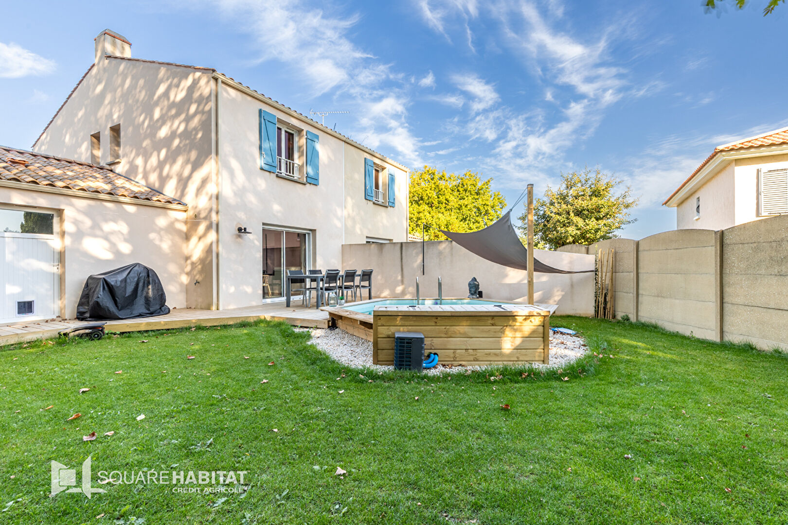 En extérieur, une jolie terrasse en bois donnant sur une piscine semi-enterrée chauffée.