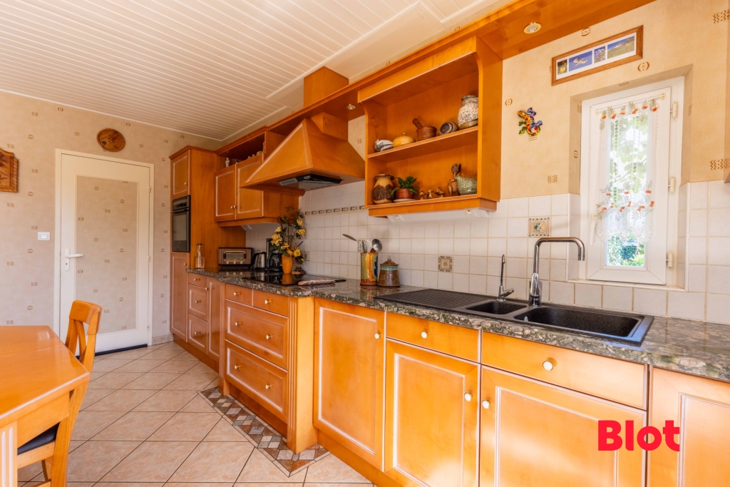 Au rez-de-chaussée, vous profiterez d'un vaste salon-séjour chaleureux avec cheminée, d'une cuisine aménagée et équipée avec un accès direct au garage et à la buanderie.