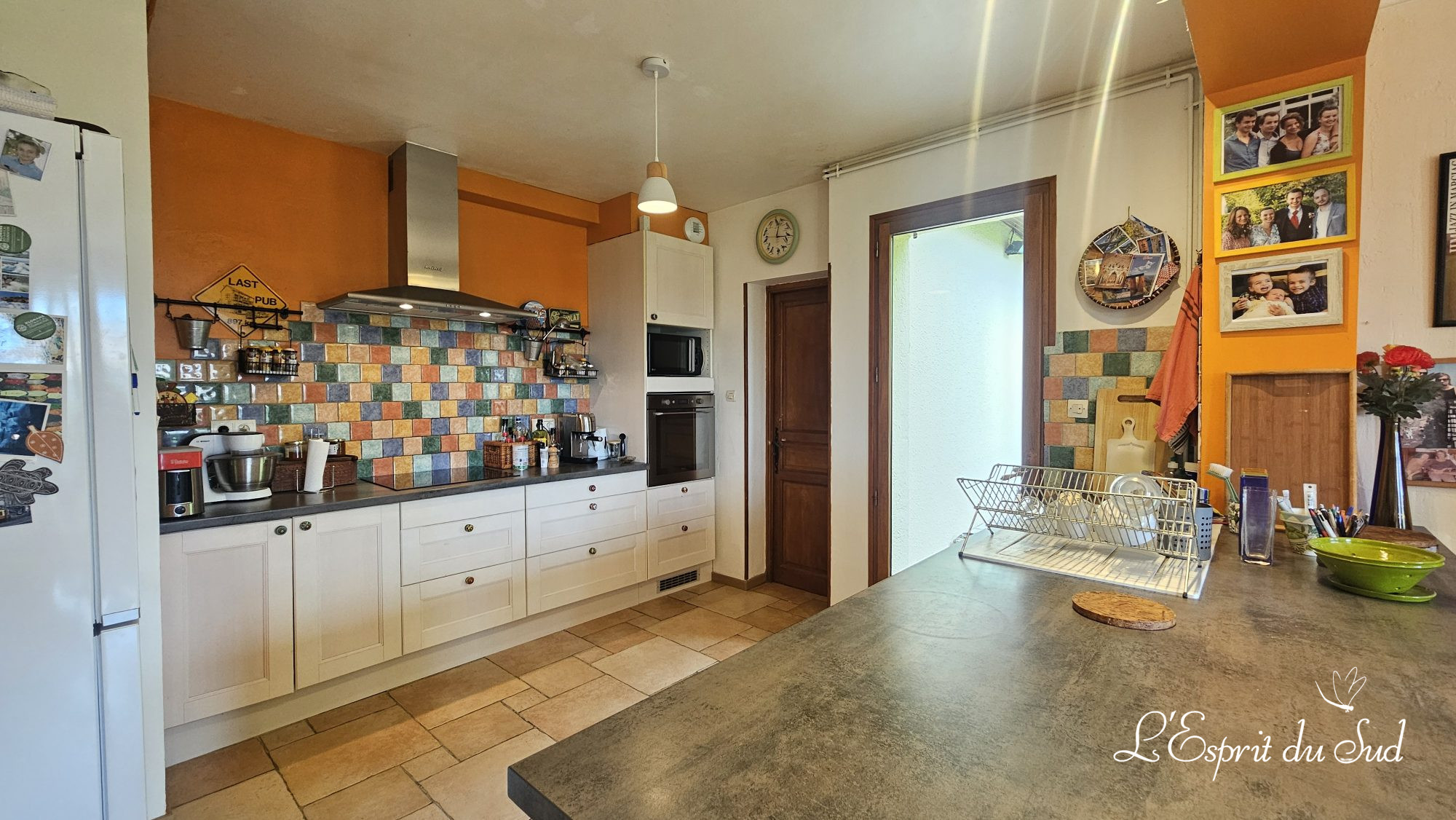 Une fois passée le hall d'entrée revêtu de parquet ( toilettes indépendantes en face), à droite, la pièce de vie ( parquet, poêle à bois) ouvre sur la cuisine américaine aménagée et équipée , et son accès sur le jardin, et le et garage/buanderie.