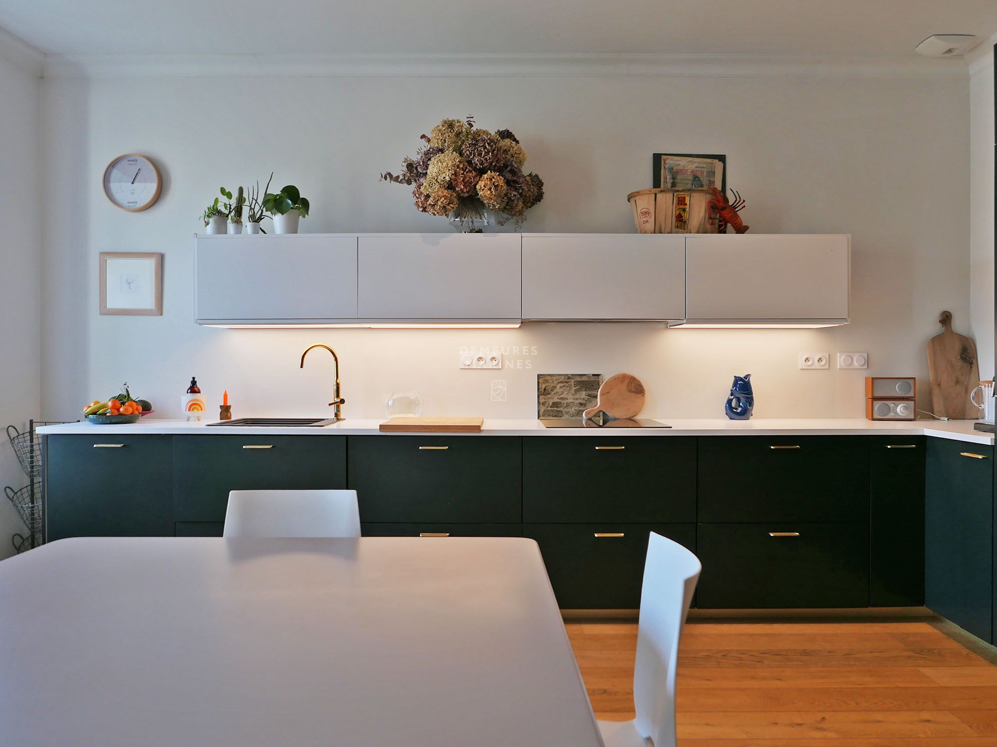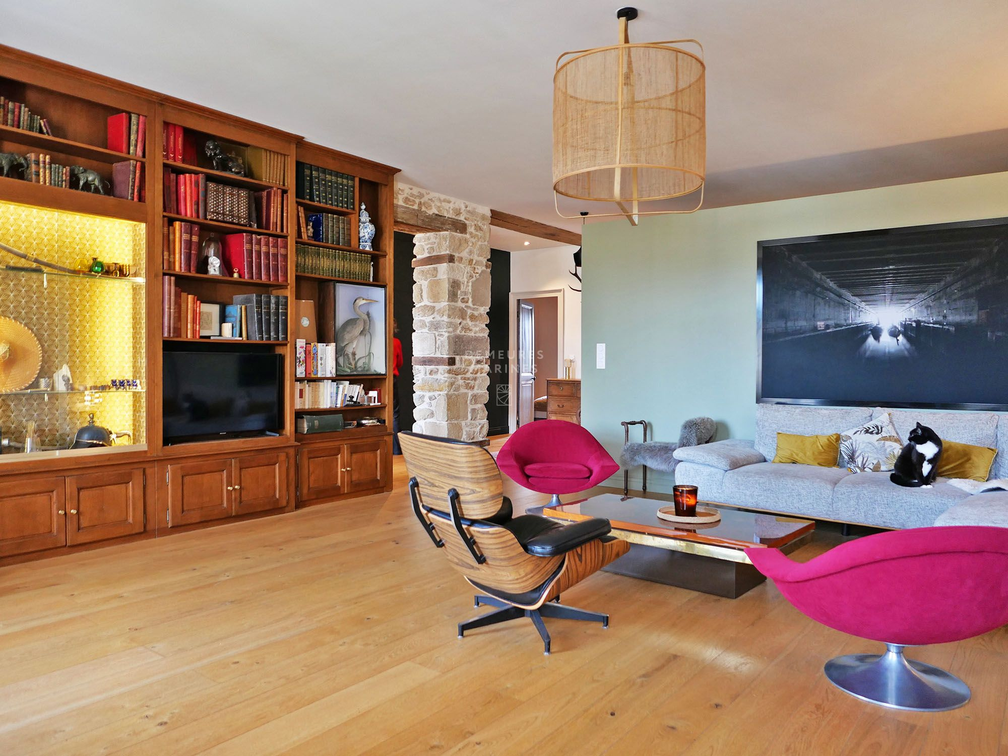 Dès l'entrée, des rangements intégrés pensés avec soin se dévoilent, donnant le ton d'une atmosphère chaleureuse portée par le mariage raffiné du parquet, des pierres apparentes et des belles hauteurs sous plafond. L'empreinte du lieu, à la fois sobre et intemporelle, se révèle au fil des pièces.