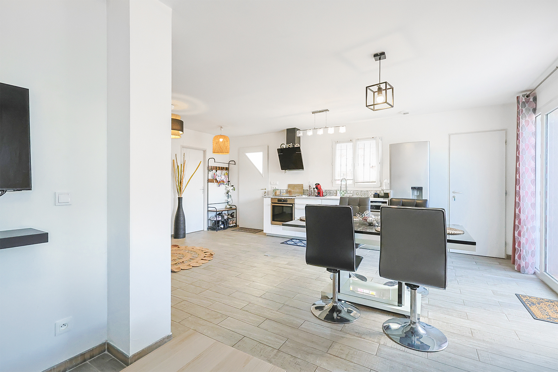 Maison T4 en RDC + 1 étage, d'une surface bien aménagée de 101m2 dont 16m2 de garage pour 85m2 hab, le tout édifié en 2018 sur un terrain plat et clos !