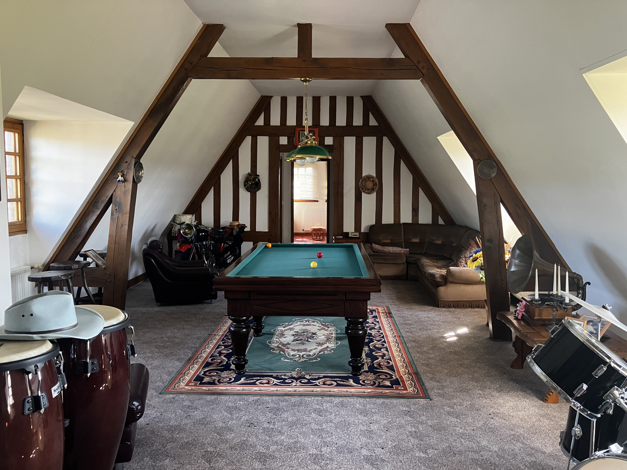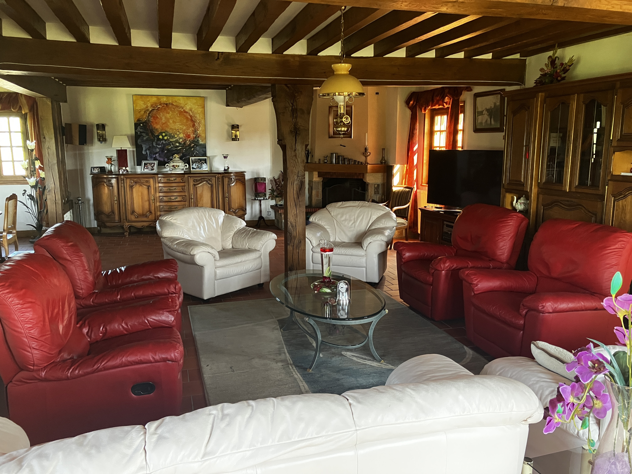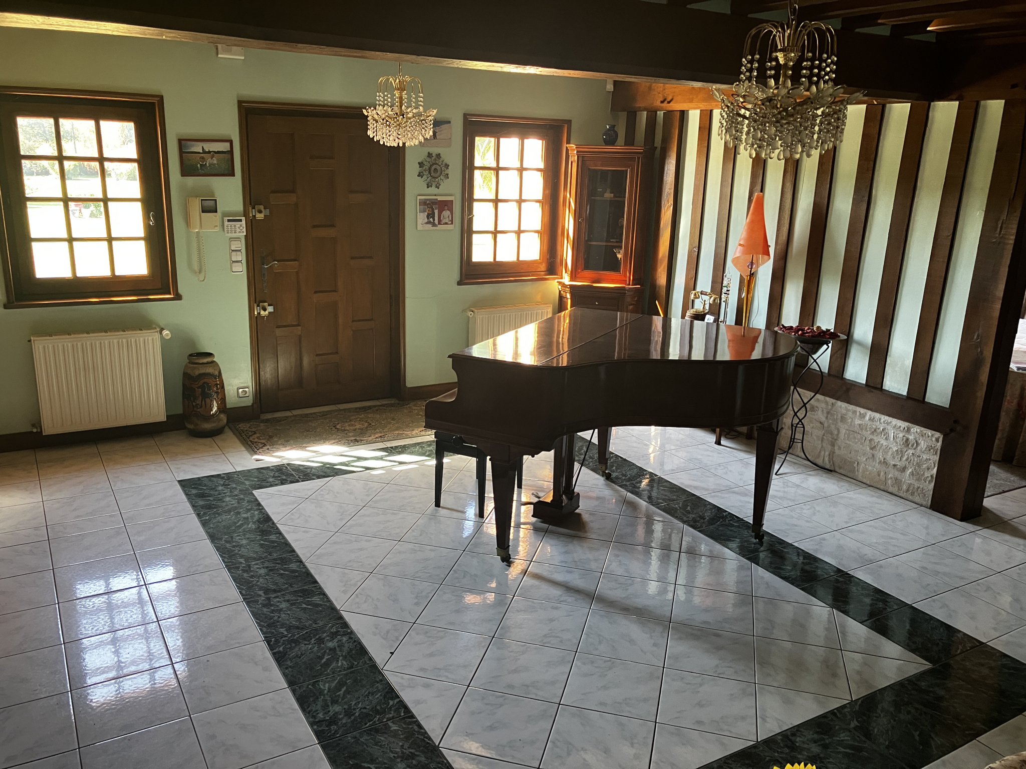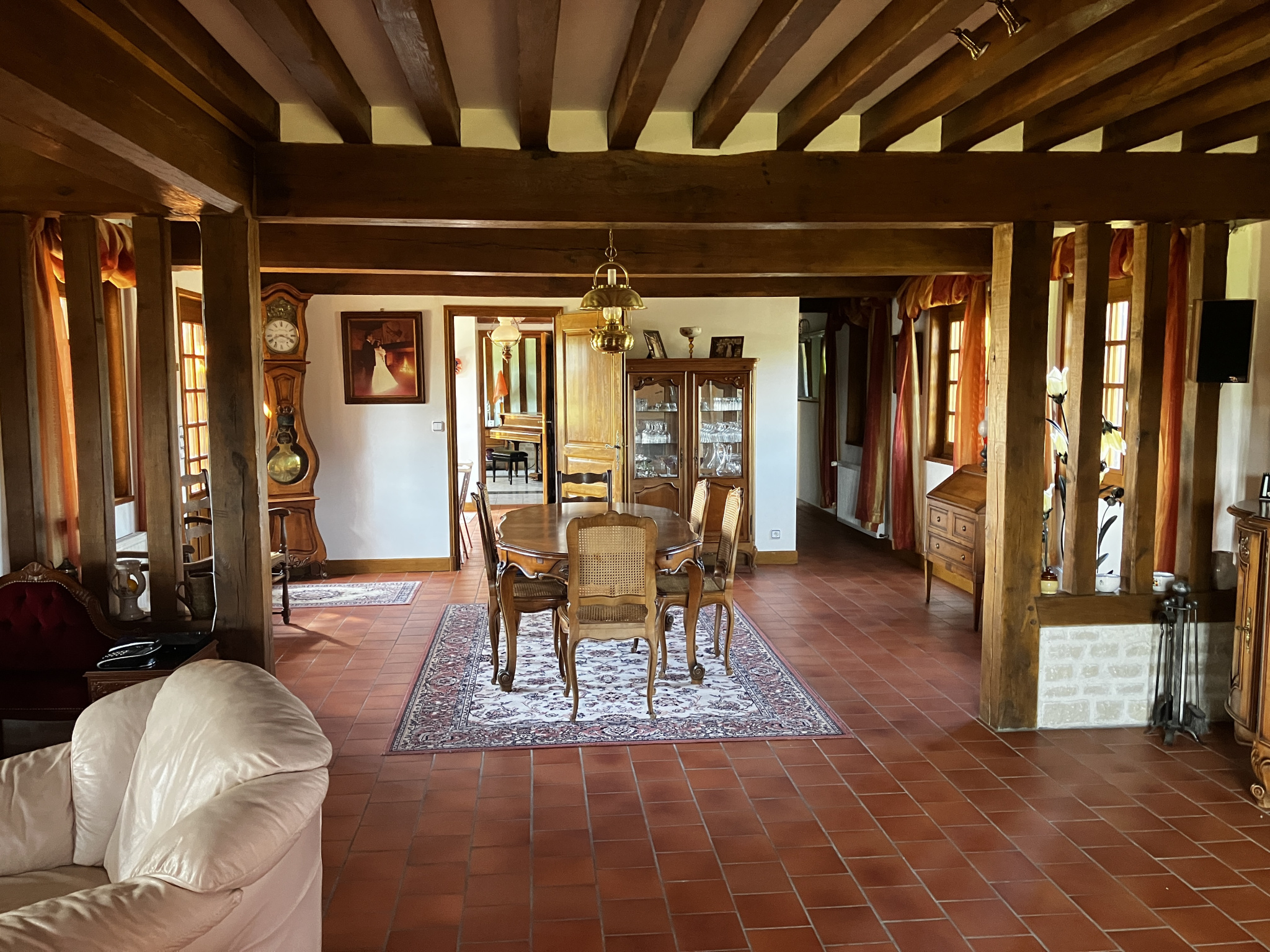 Jolie propriété traditionnelle à colombages édifiée sur un grand terrain arboré avec tennis et située dans un village avec commerces et écoles. La maison, d'une surface habitable de 276.50 m2, comprend un sous-sol total avec garage, atelier, chaufferie et rangement. Au rez-de-chaussée : hall d'entrée de 31.90 m2, salon-salle à manger de 73 m2 avec cheminée, cuisine aménagée de 16 m2, chambre de 16.70 m2 avec salle de bains de 7.20 m2, wc. À l'étage : pièce palière de 58.80 m2 formant salon-salle de jeux, deux chambres (27.80 m2 et 23.20 m2), salle de bains/douches/wc de 12.50 m2.