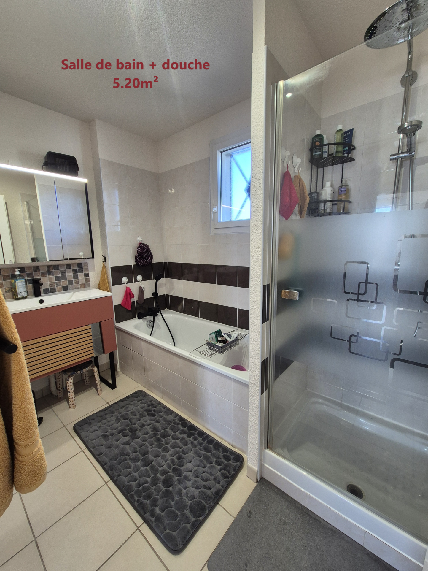 Etage : 3 chambres de 14.25m2, 10.90 et 9.15 avec parquet, placard aménagé, radiateur économique, Double vitrage, Moustiquaire. Salle de bains avec fenêtre (Meuble vasque de qualité, Baignoire, Douche parroie, Sèche serviette électrique) - wc séparé