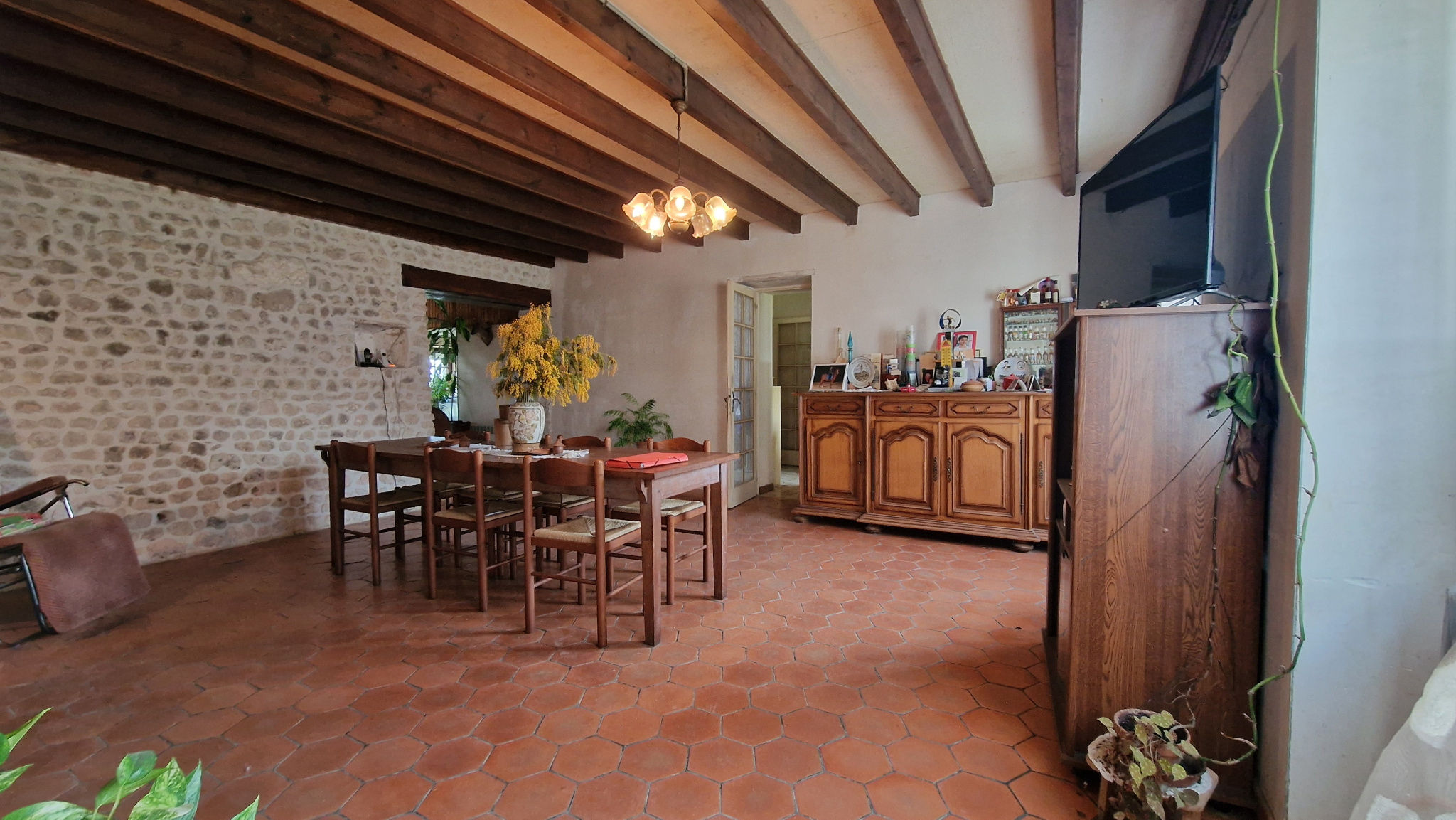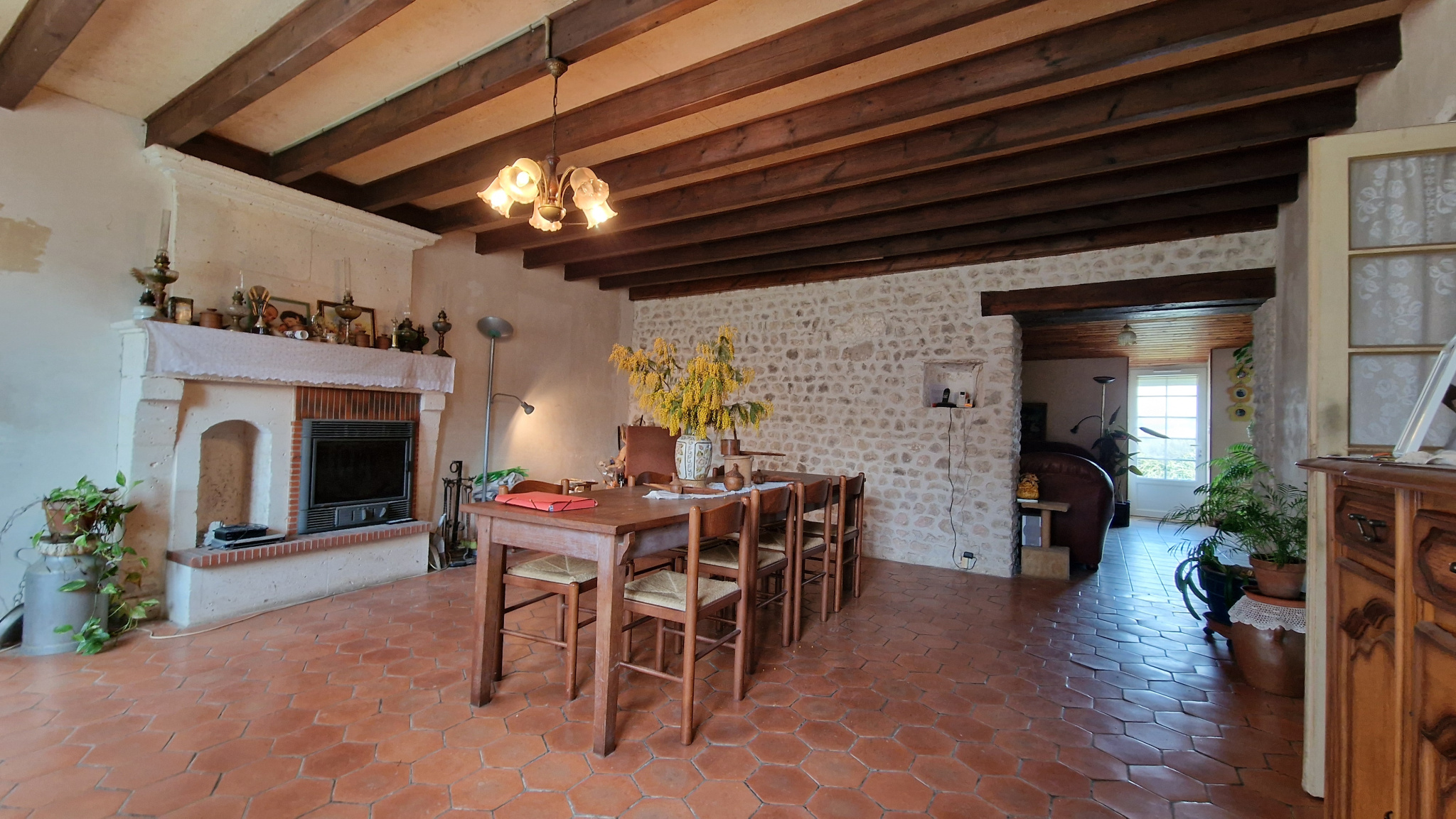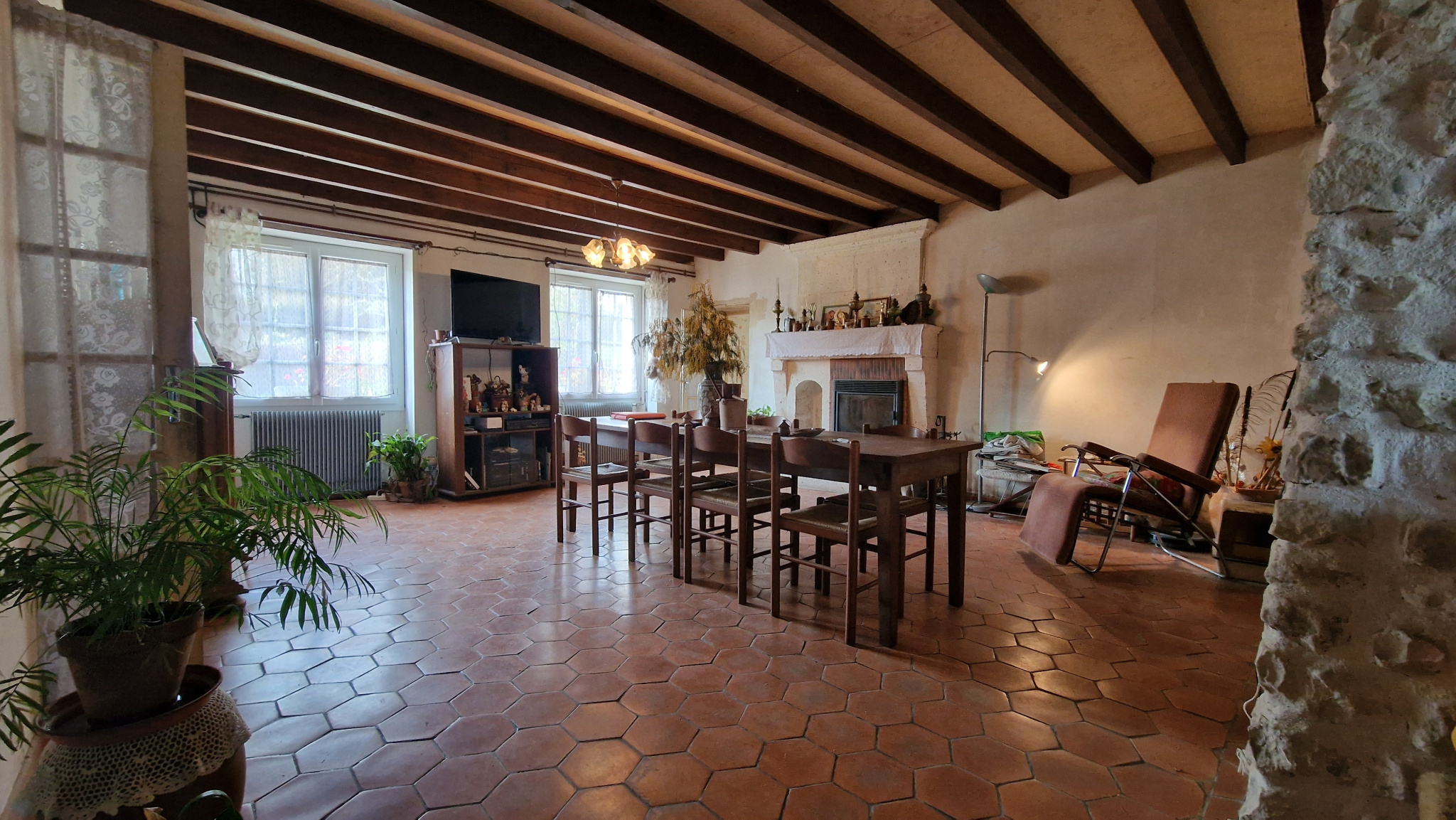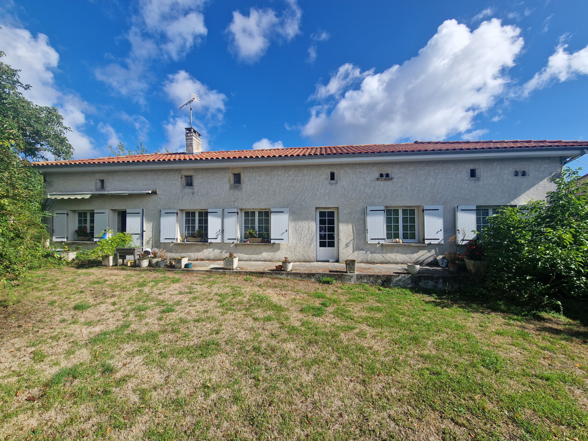 VAL-DES-VIGNES (16250) - A 10 min des écoles et commodités de CHATEAUNEUF (16) et de BLANZAC - Cette ancienne fermette se compose de plain-pied d'une cuisine, salon, séjour, trois chambres, deux salles d'eau, deux wc. Chauffage central par pompe à chaleu, menuiseries pvc double vitrage. Belle grange indépendante, appentis, assainissement individuel. Les toitures sont neuves. Environnement très agréable, au calme, avec un terrain de plus de 7 000 m2 en partie clos et arboré de chênes truffiers. Cour intimiste, tilleuls remarquables, l'ensemble est charmant.