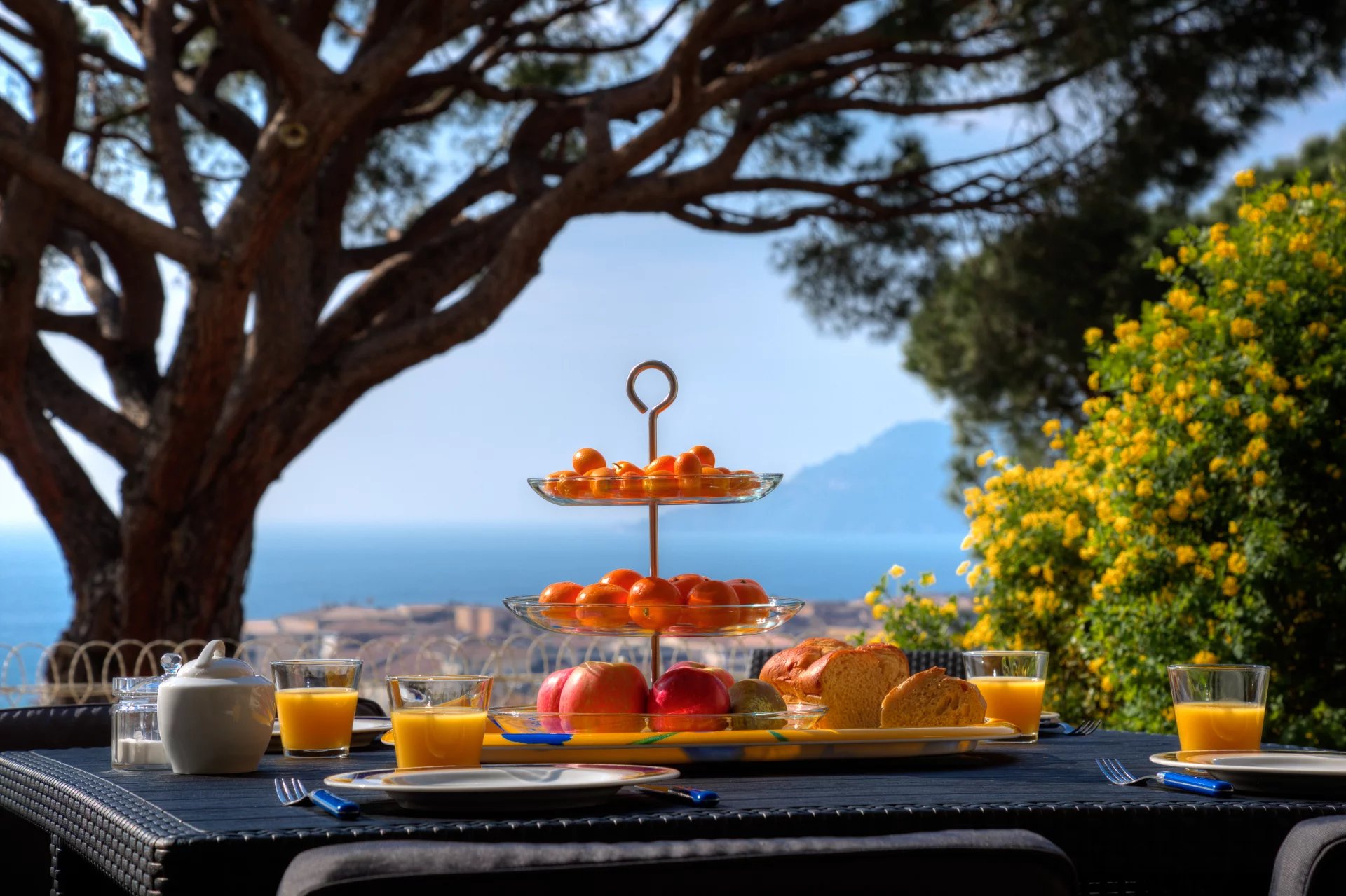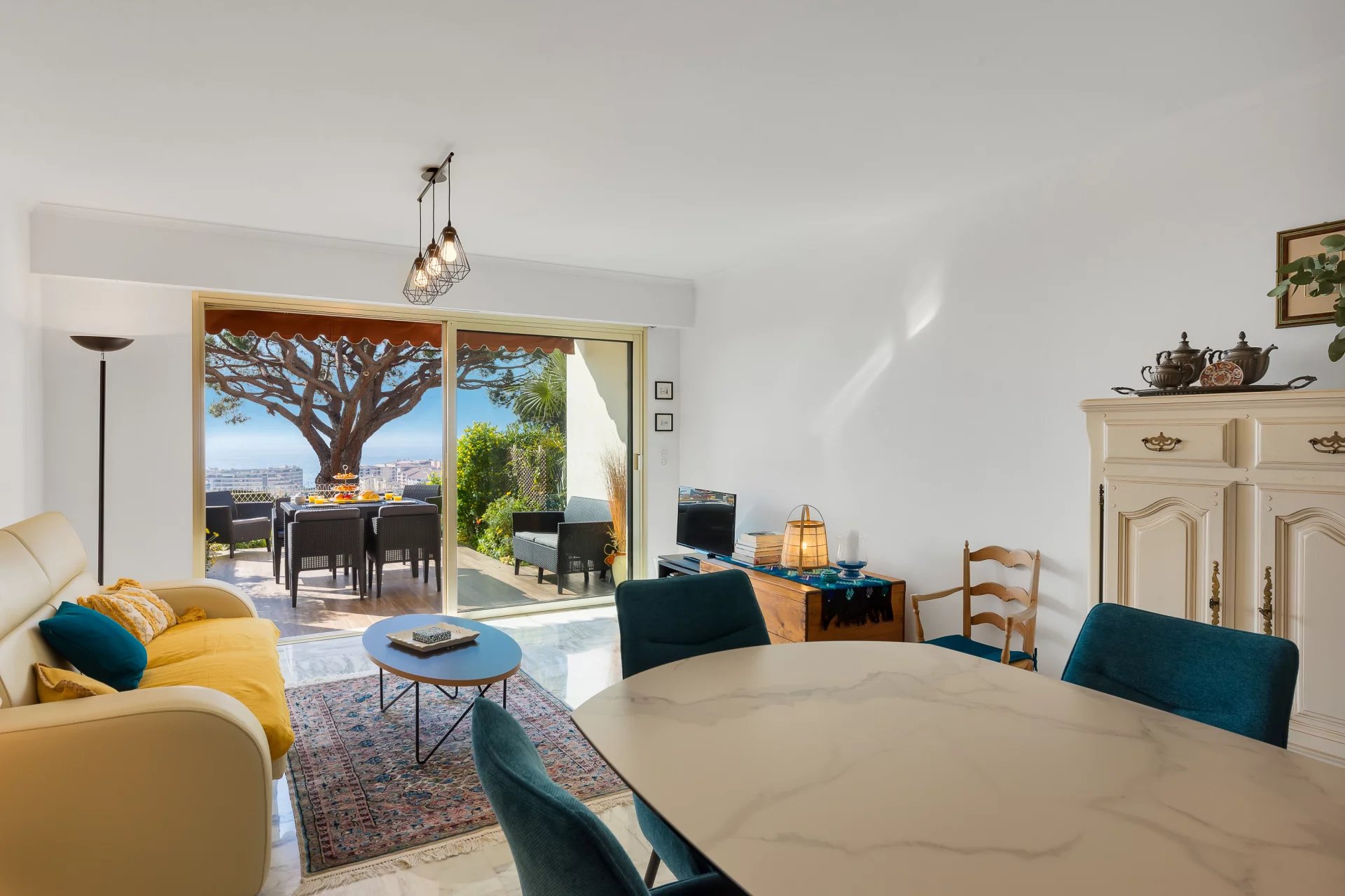 Vue mer imprenable depuis une terrasse de 20 m² exposée plein sud. Balcon côté nord.