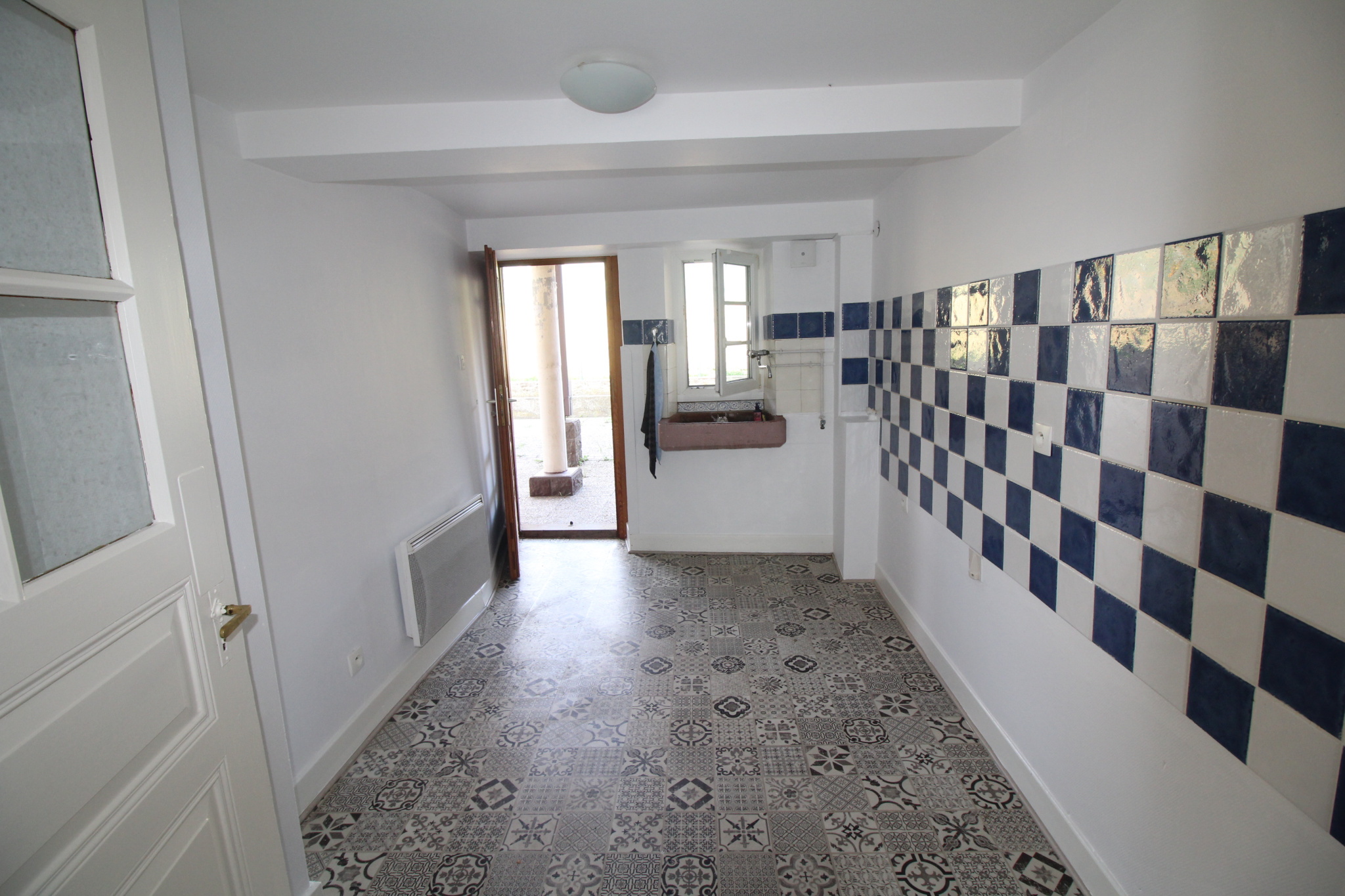 -au rez-de-chaussé, une entrée, un salon séjour, une salle d'eau (WC et douche), une cuisine donnant accès à une Terrasse, 2 chambres et une cave.